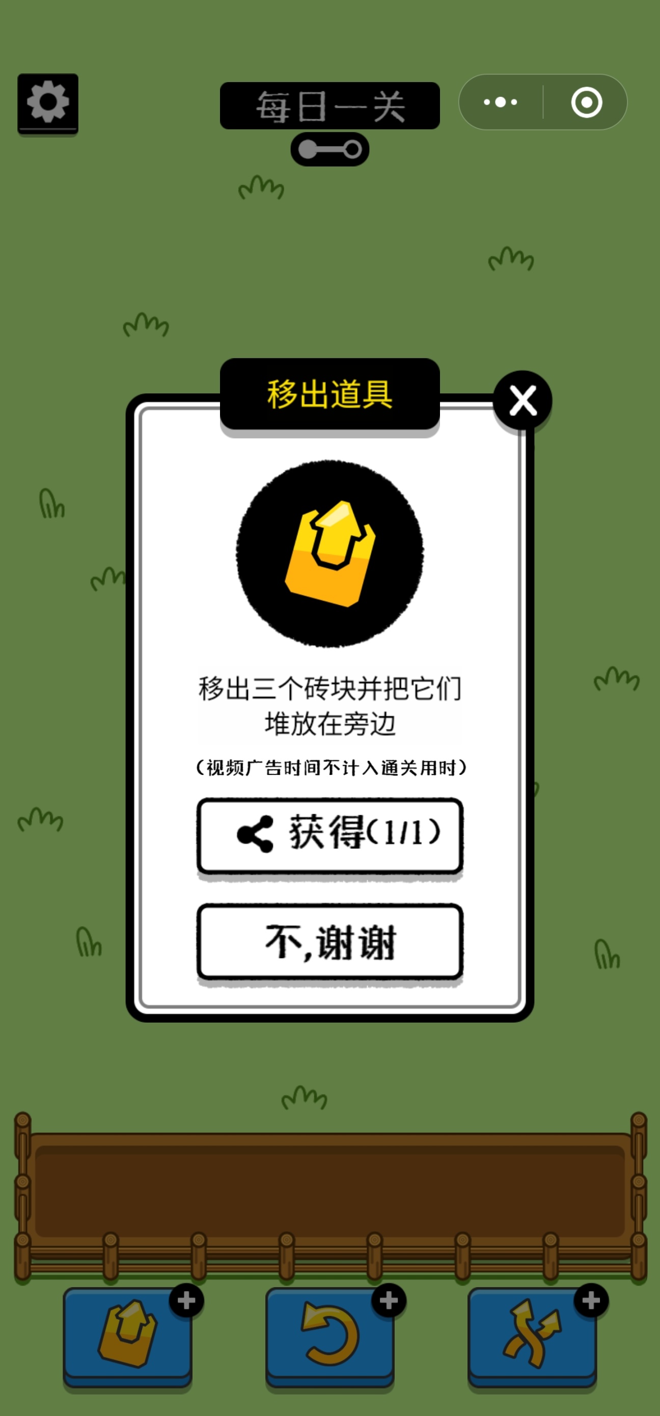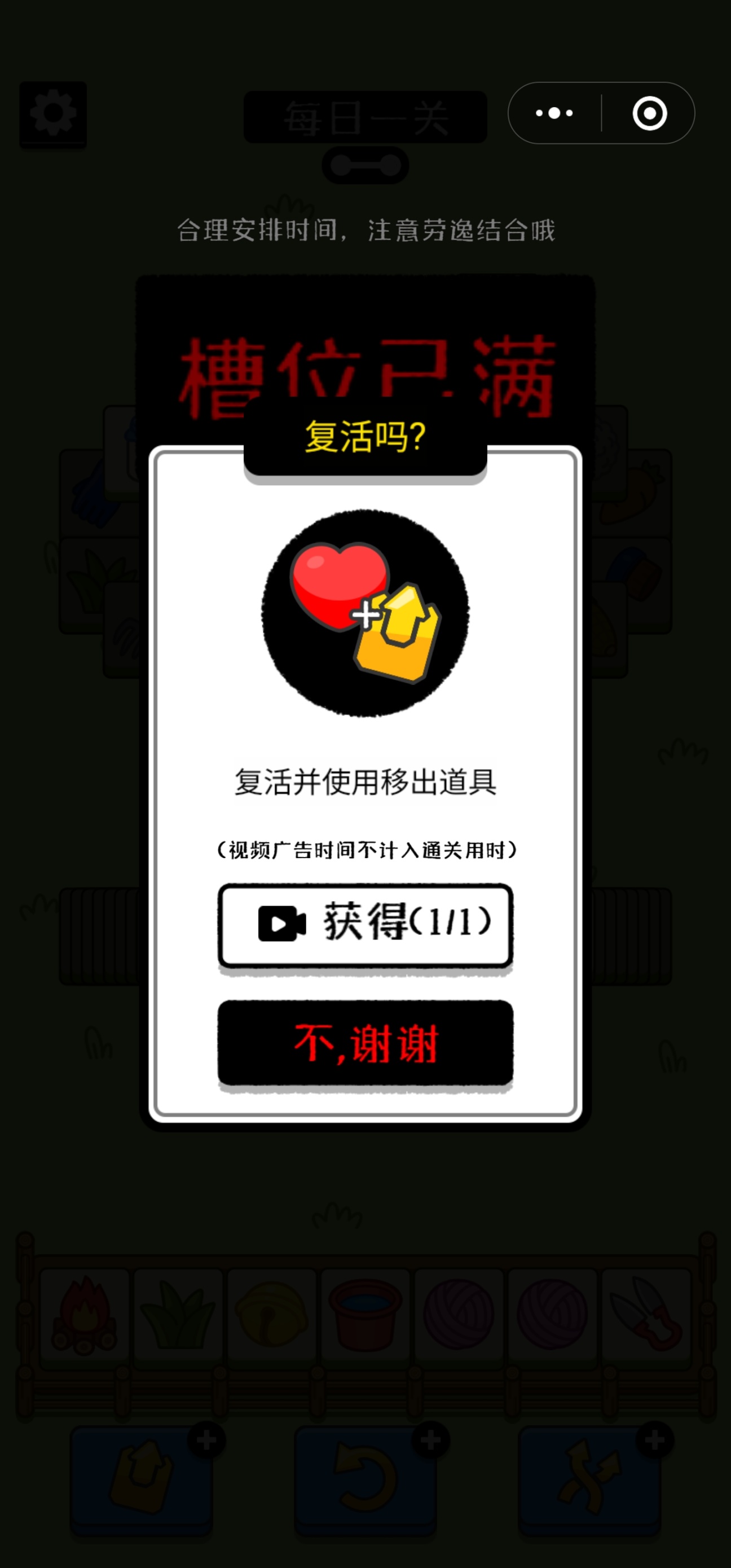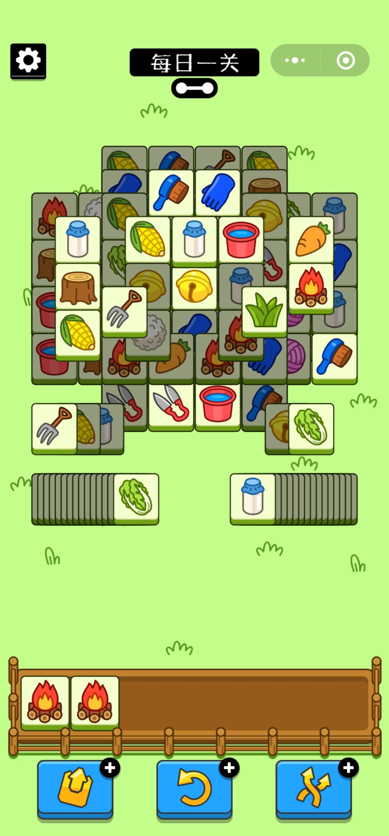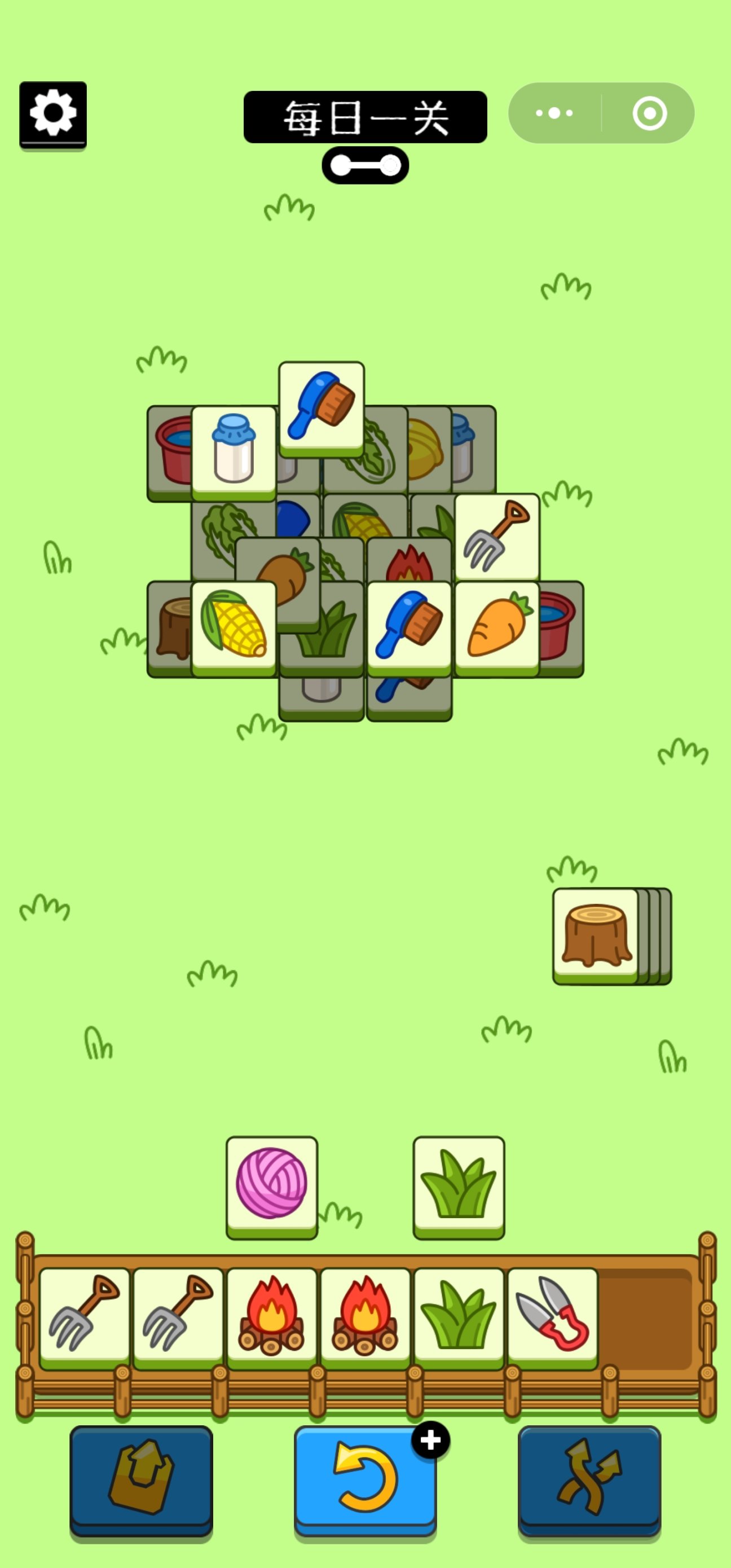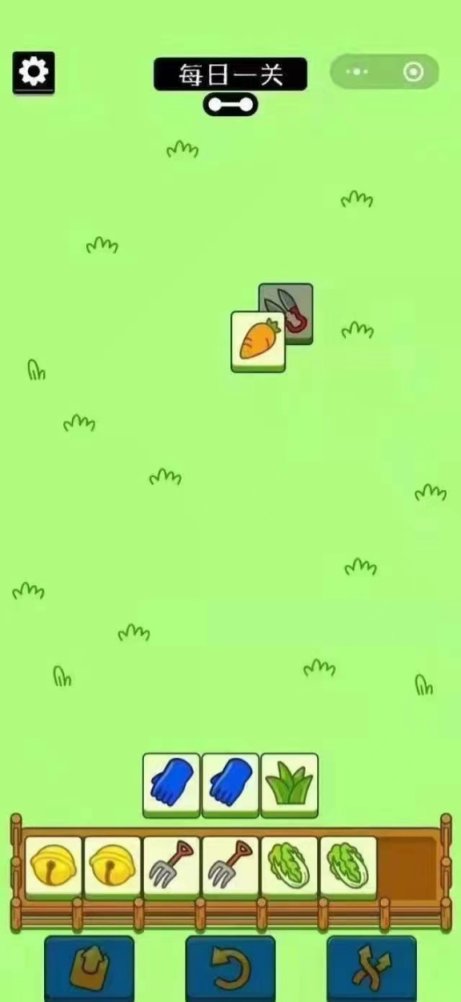 初进游戏,一天仅有一关的名号吸引了我,游戏的玩法很简单,仅仅是选图案到下面的槽位里,凑齐三个相同的便可消除,消掉场上所有的图案即可通关,正当我以为这个游戏不过如此时,事实证明是我太小巧他了。