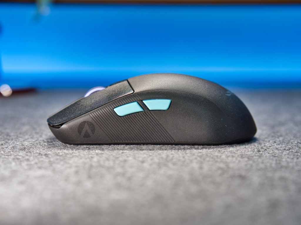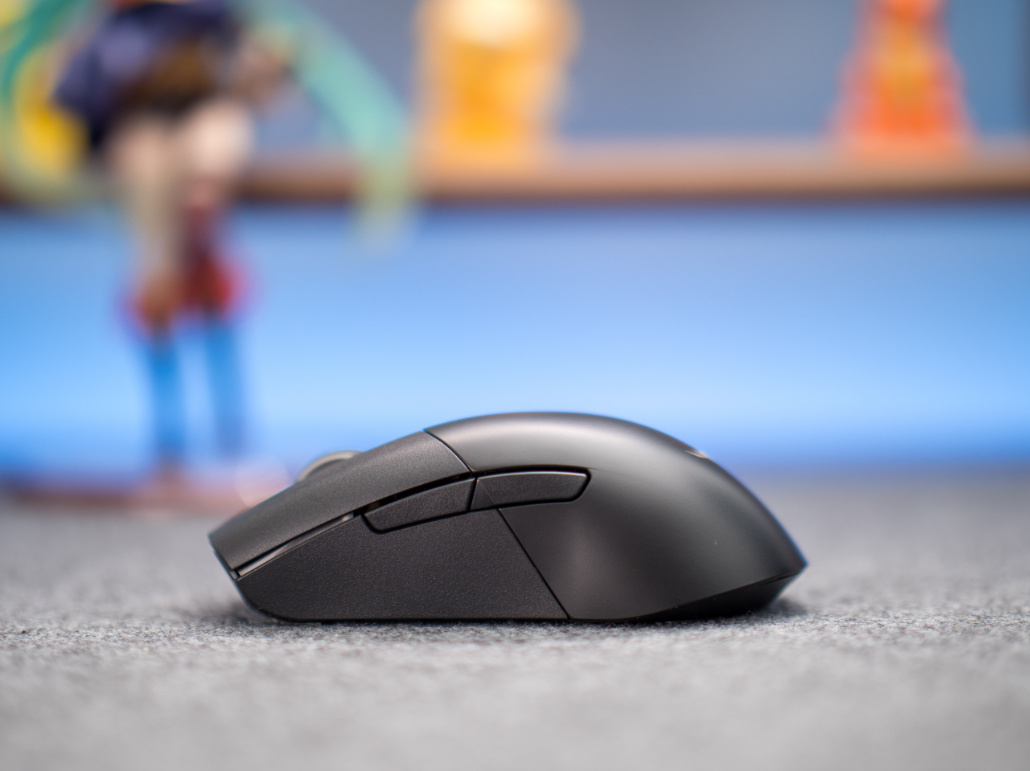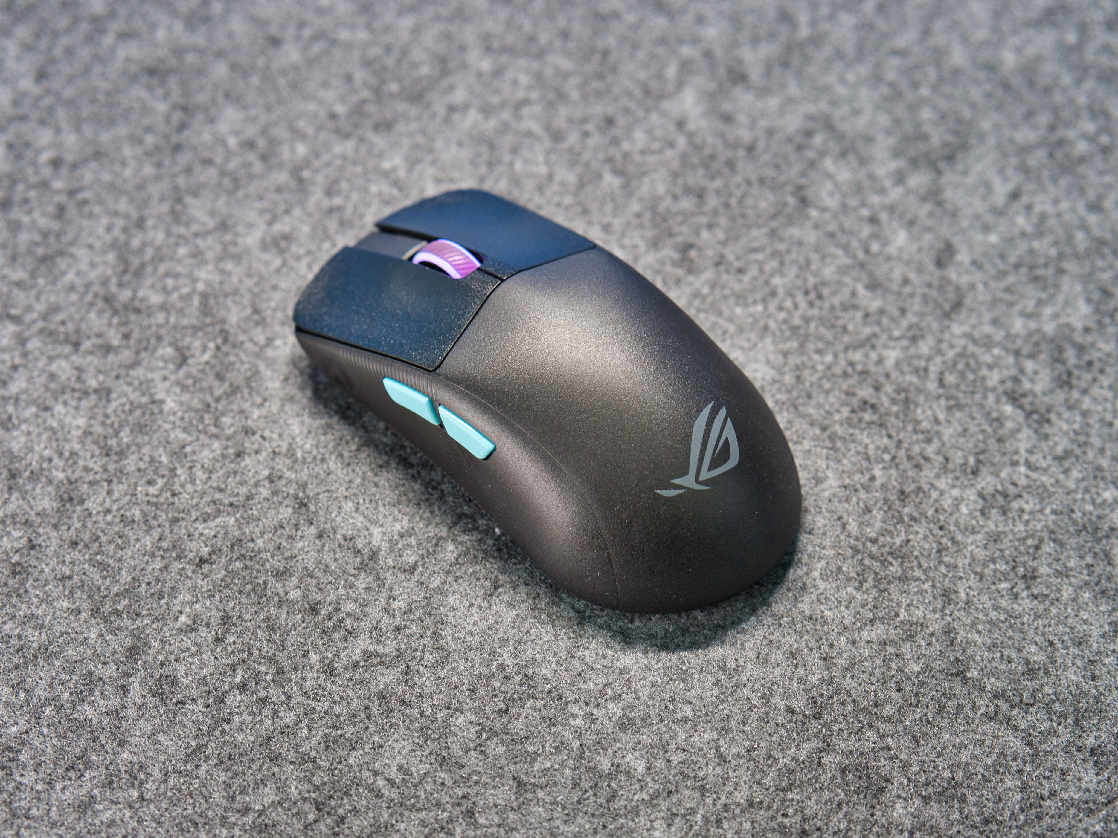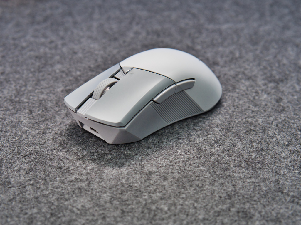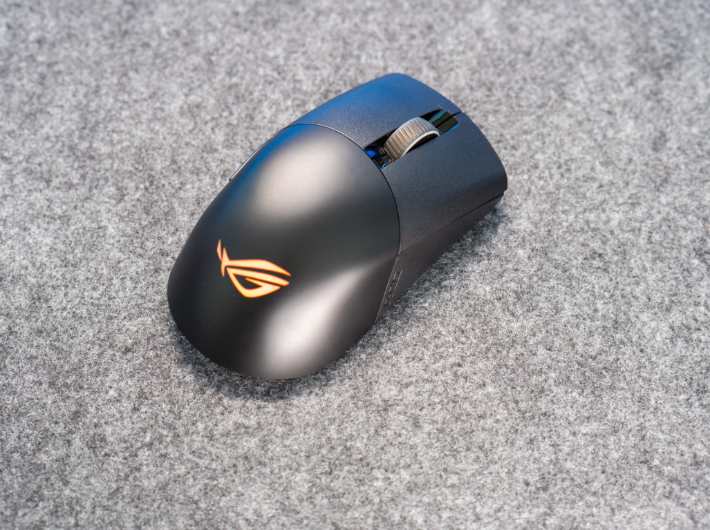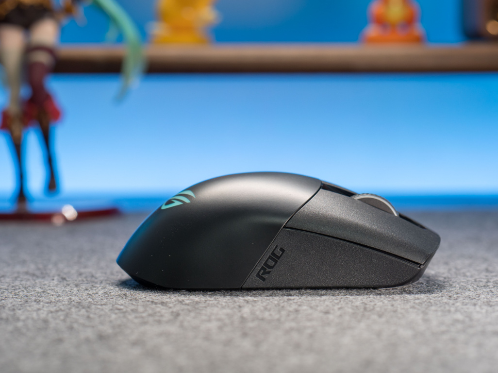 和罗技MX Master3类似,ROG月刃无线AP版也是面向右利手的非对称人体工学设计,用久了之后手腕要比对称鼠标更加轻松一些。左右按键是PBT材质,阻尼感良好,虽然包装里赠送了防滑贴纸,但是个人感觉其实没必要贴了。