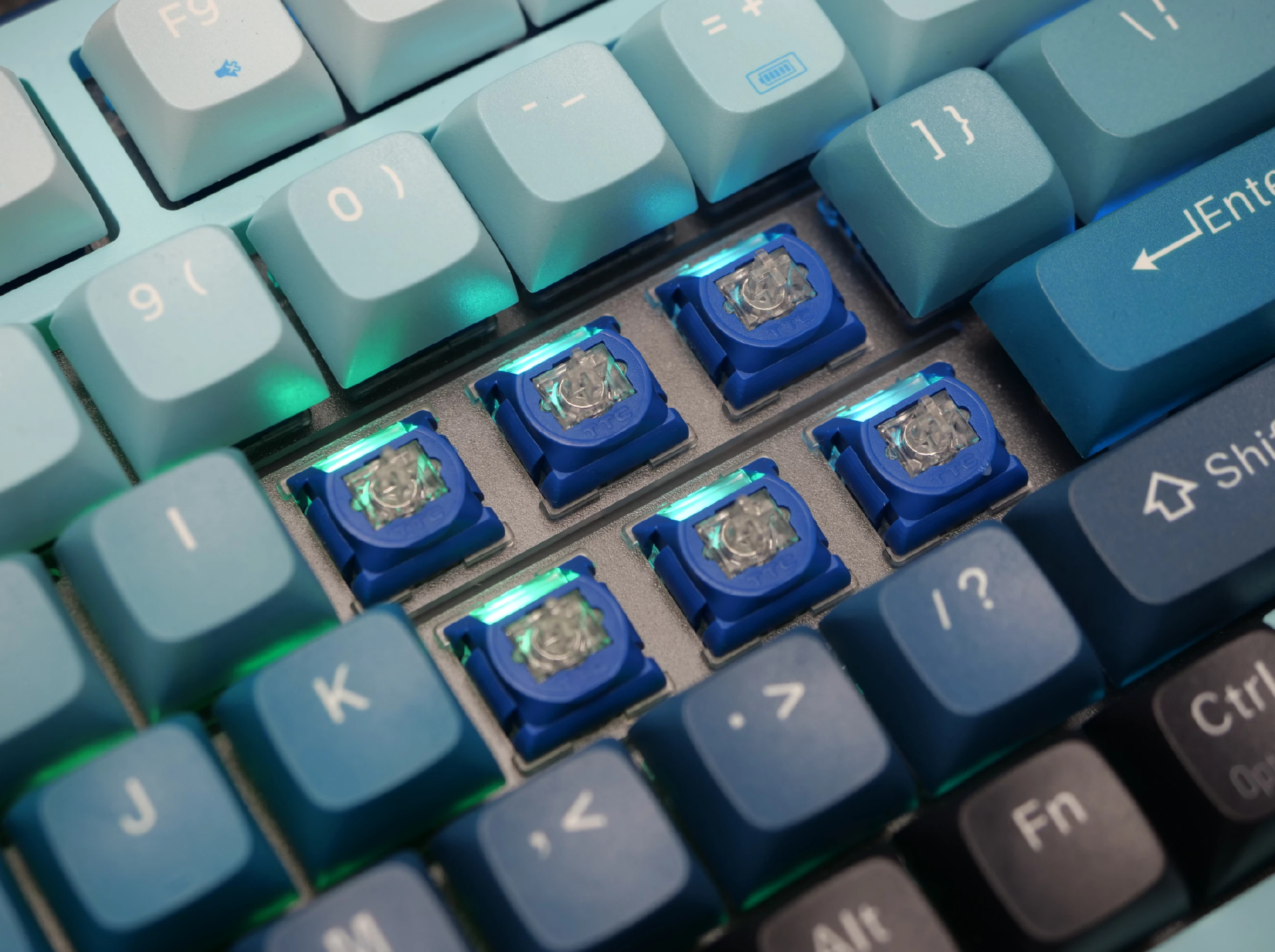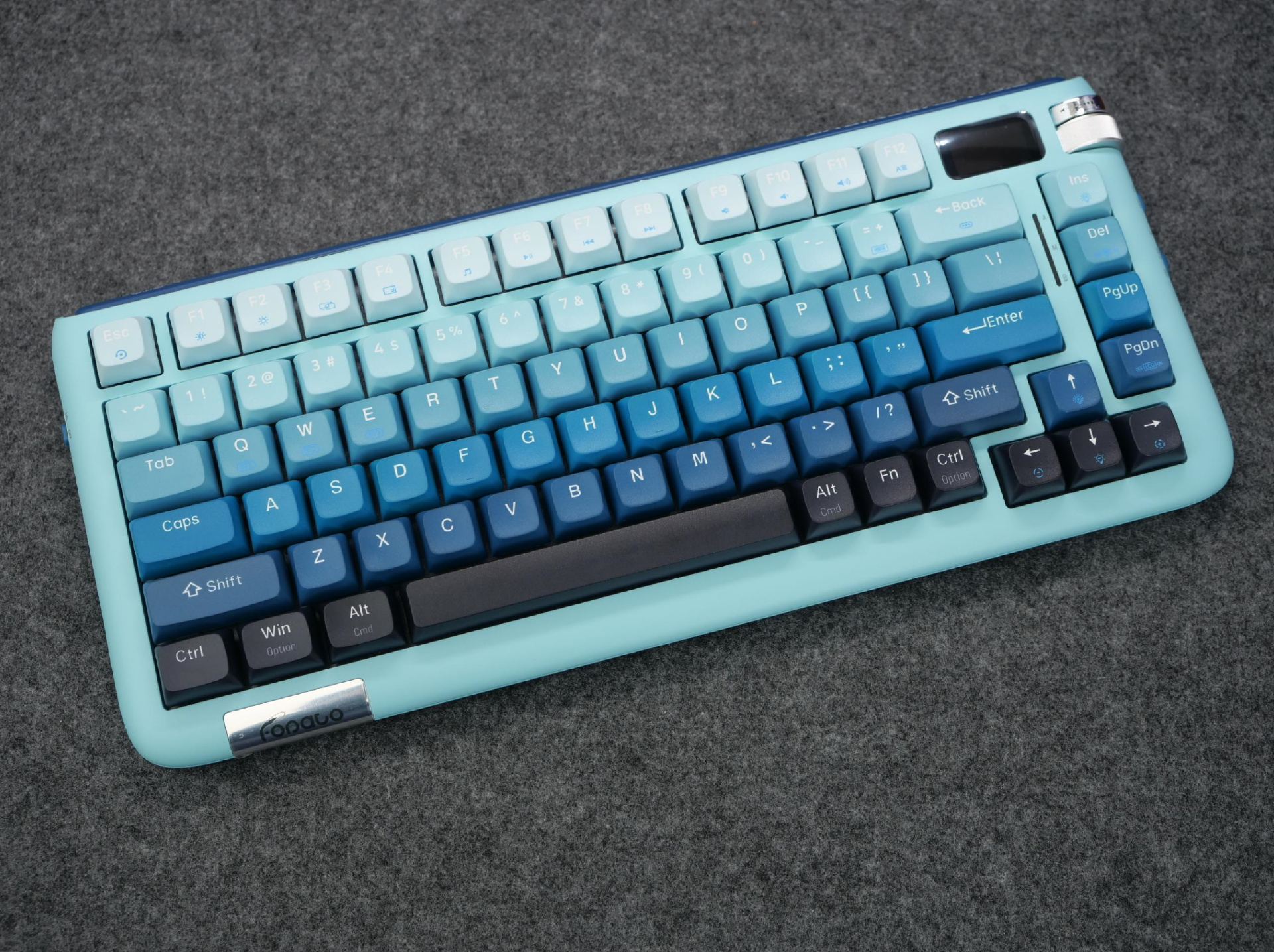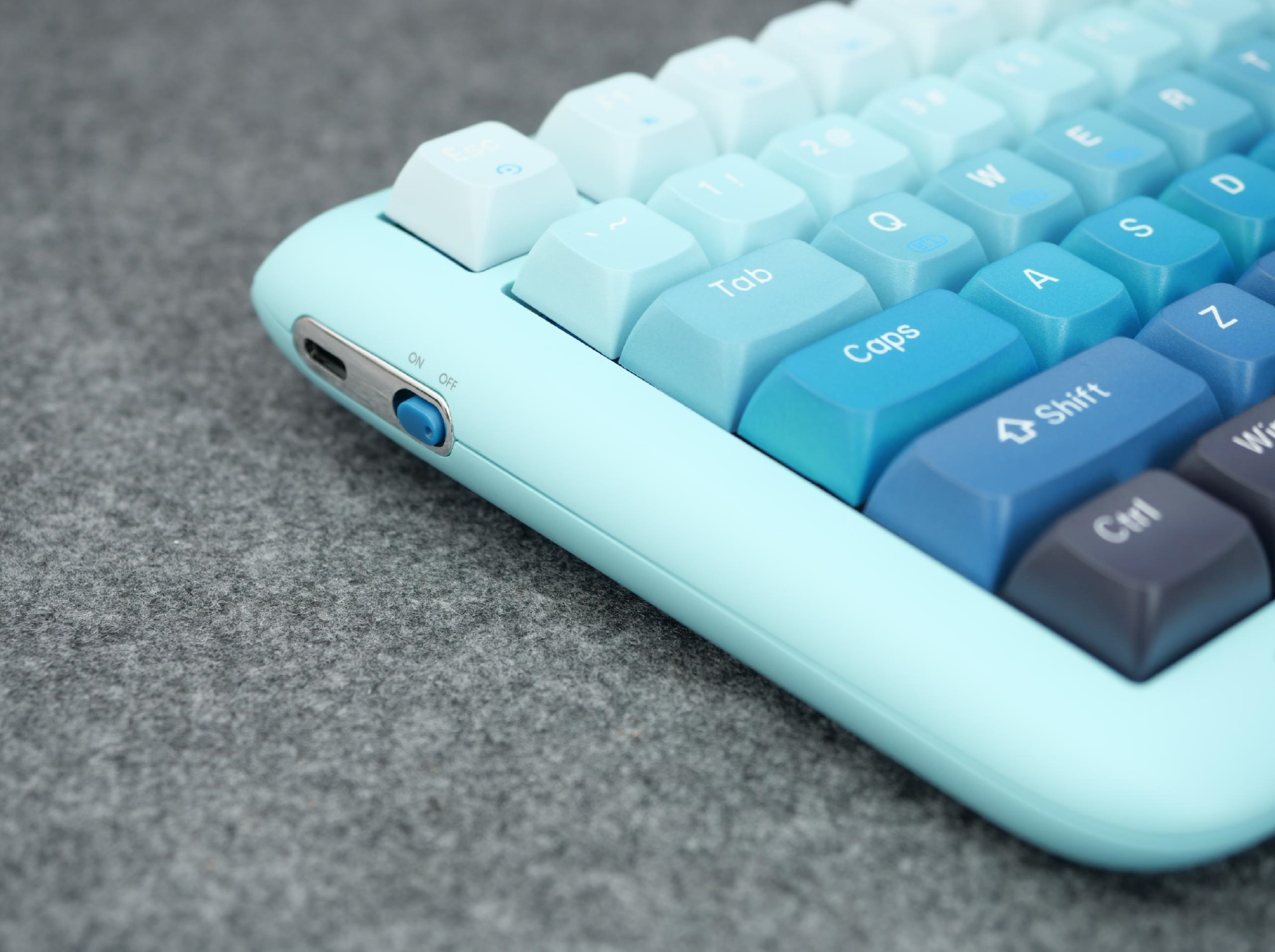 这应该是我近年来上手过的颜值最高的机械键盘之一了,整体造型非常圆润可爱,渐变蓝配色的PBT双色注塑键帽非常优雅,很有一股子水墨风的感觉,放在桌上就好像真的能体会到孤舟独钓寒江雪的味道,很佩服设计师的审美功力。