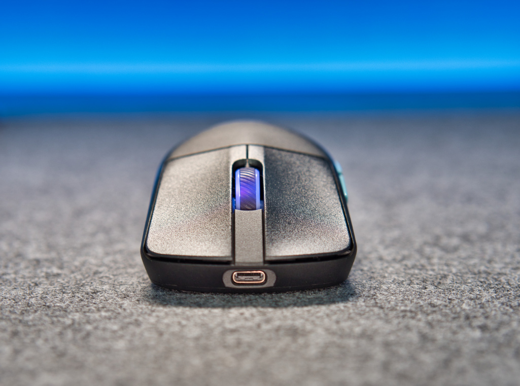 由于这款鼠标是极致轻量化的设计,所以很遗憾没有和战刃3和月刃一样在背部安置败家之眼RGB灯,在尾部只有一个不能发光的眼睛LOGO。所幸在鼠标滚轮处带有RGB灯光,还支持神光同步,多少也能增加些战斗力吧。
