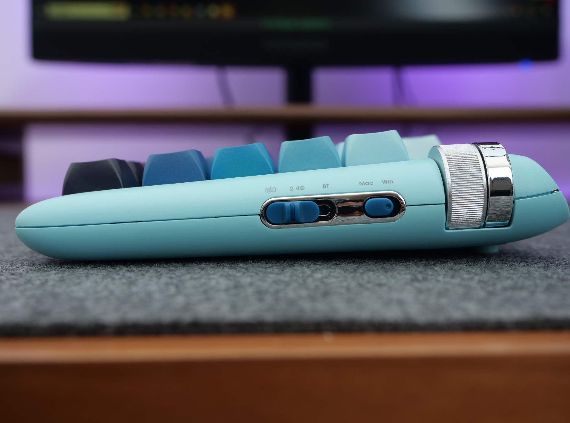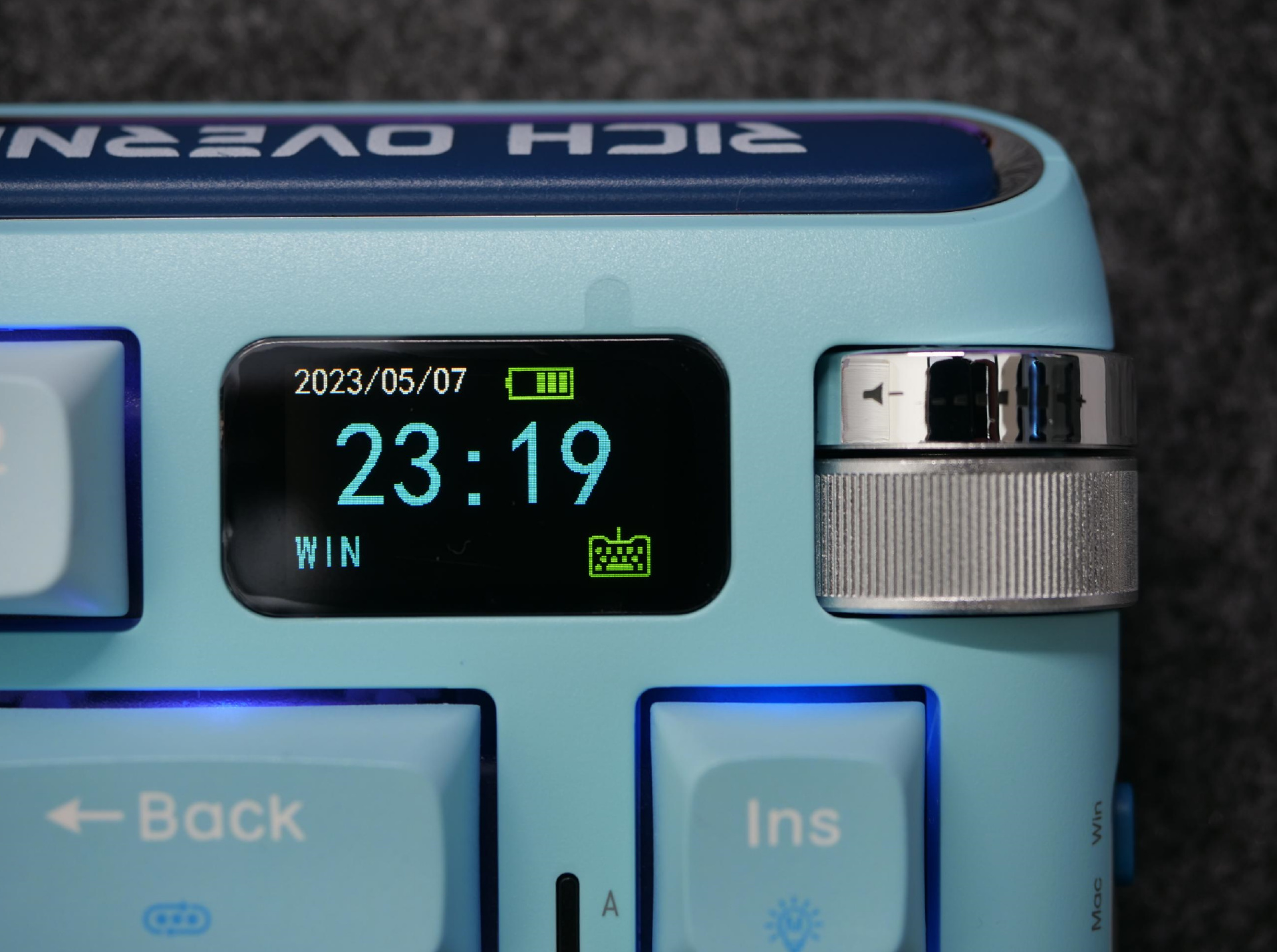 作为新键盘,最近大火的键盘屏幕和旋钮也在这把键盘上搭载了。这块TFT彩色小屏幕可以显示日期时间、电量、连接方式和系统模式,还可以播放自定义GIF动画,很好玩。银色的旋钮做工也很精致,用来调节系统声音非常方便,而且是很顺滑的无极旋转模式,手感不错。