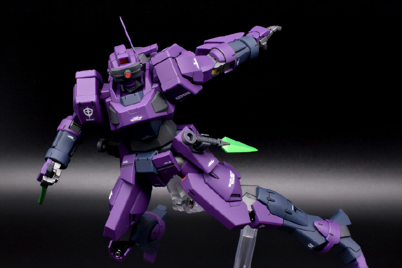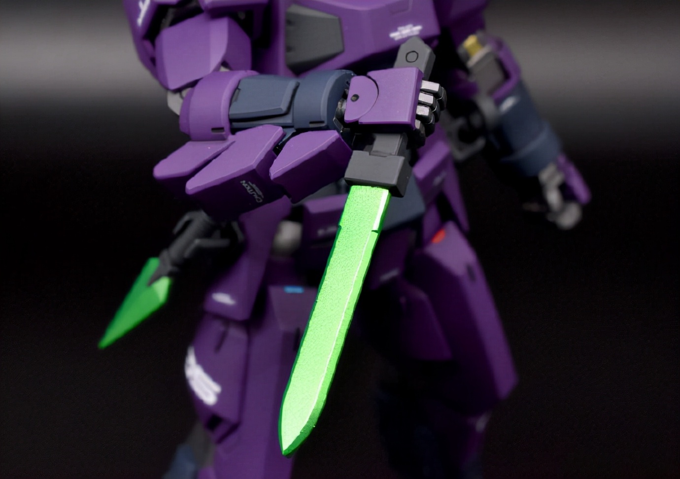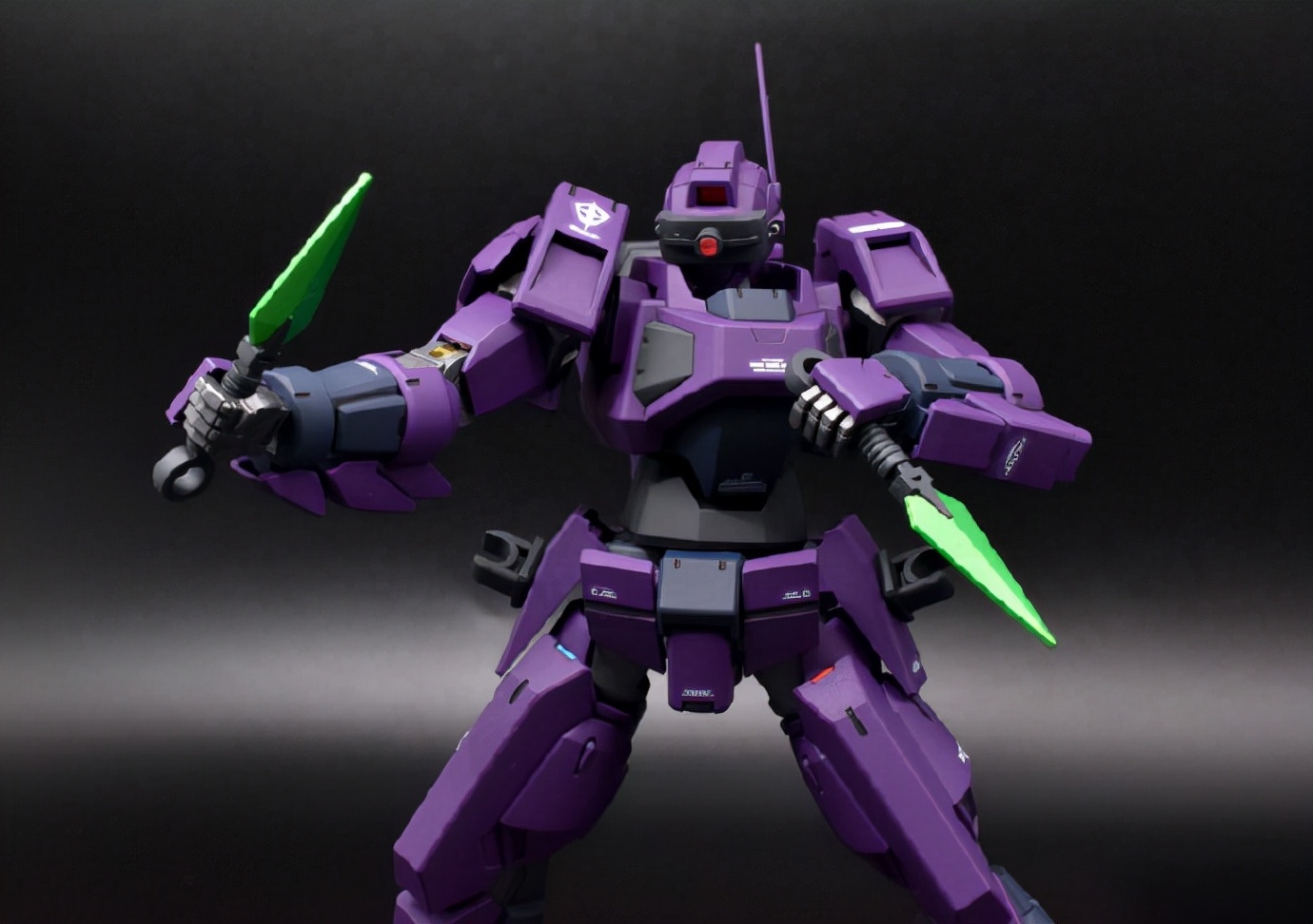 模友將原版的配色進行了重塗,主要配色重塗成了紫色,裝備使用的配色是綠色,紫色和綠色的結合是不是看着有點眼熟?沒有錯!有點EVA初號機配色的感覺。爲了豐富這款模型的細節,紫色外甲部分增加了細節水貼,一些需要分色的零件模友也進行了細節塗裝,改造之後的模型整體還是不錯的。