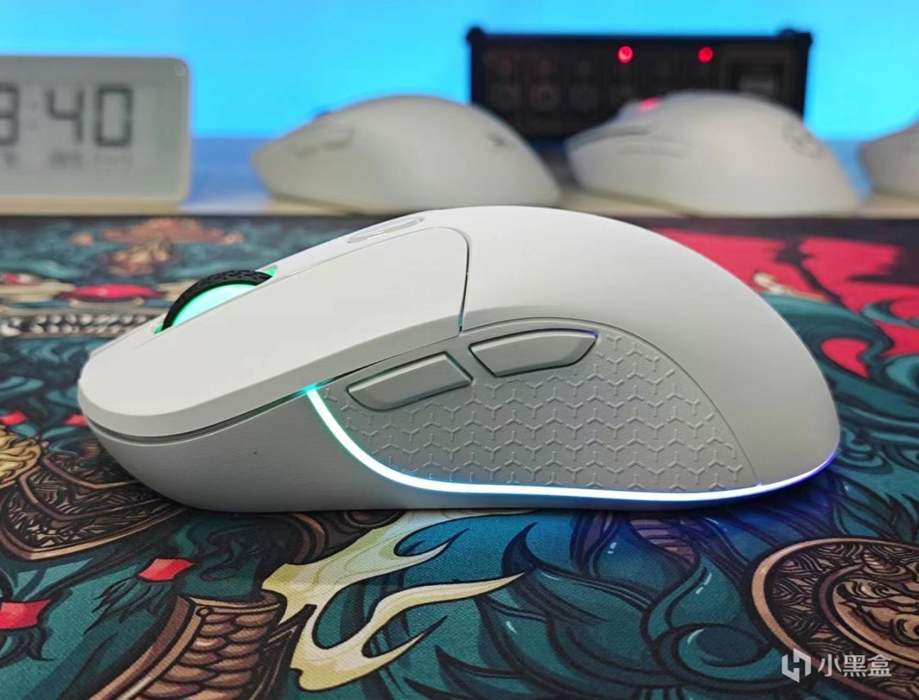 不同於一衆 3395 鼠標都追求極致輕量化,M3 並不追求極致輕量化,79g 的重量和羅技 GPW 差不多,這樣的好處在於能夠保證外殼的高強度,還可以加入不少 RGB 燈效,鼠標設計有 RGB 滾輪燈和 RGB 環形燈帶,顏值還挺高的。按鍵上鼠標搭載的是凱華 GM8.0 微動,理論壽命 8000 萬次,手感偏硬。