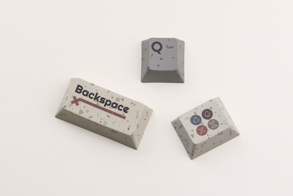 這三種顏色是模擬比較常見的塑料原始顏色,由於再生塑料通常是通過回收和混合不同類型的廢棄塑料製品得到的,因此再生塑料顆粒中可能包含多種不同顏色的塑料混合,呈現出多彩或混合色的外觀,所以摻入了各色雜質,不過所用的顏色都比較淡,沒有太過鮮豔的雜質色,同時基底色呈現出的中性感和平和感也使得整套鍵帽沒有太過扎眼。