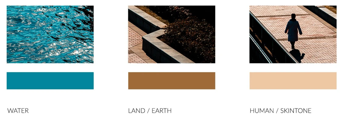 題外話:其實看到這裏,Earth Tones是否該翻譯成「地球音」,我個人有一些別的看法,配色由圖中元素提煉而成——人的皮膚、土地的表面、水面,雖然Tones直譯確實有音調的意思,但「Earth Tones(土壤色調)」作爲一個在藝術和設計領域廣泛應用的術語,再結合作者的主題設計,翻譯成地球音還是略顯粗糙了。