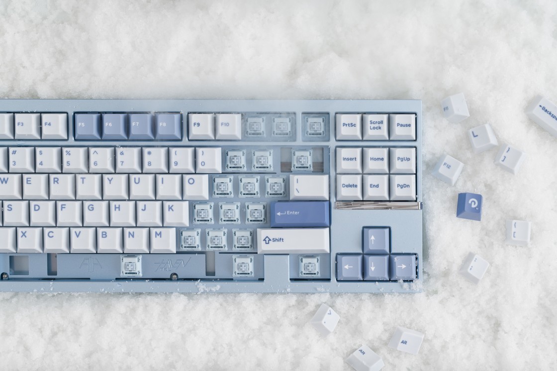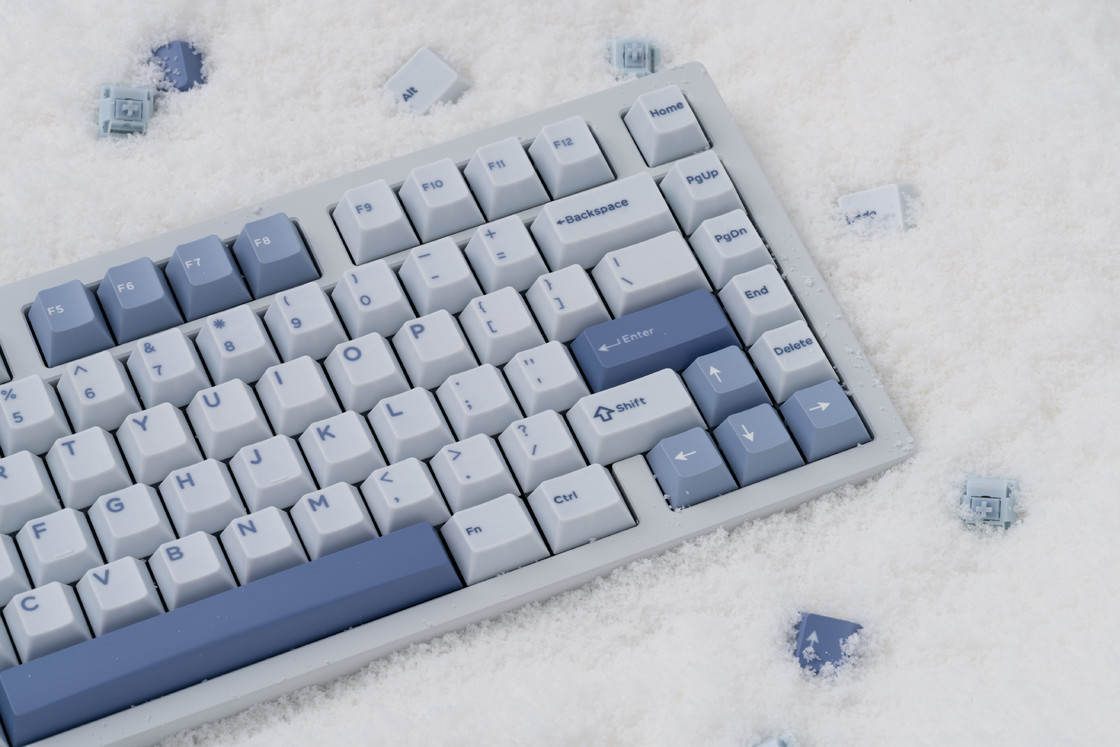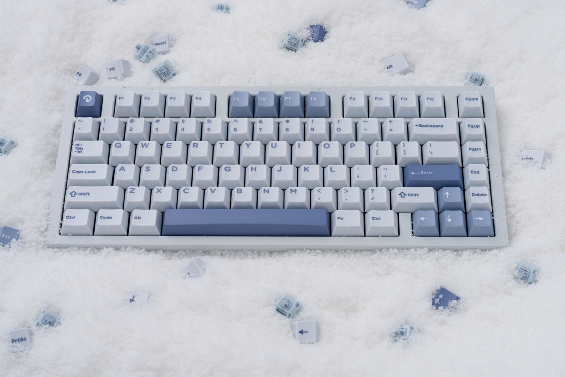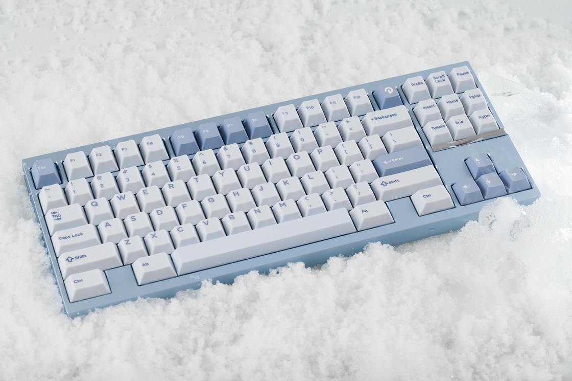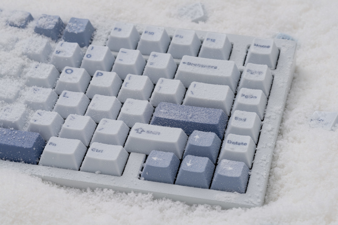 其實藍白色系的鍵帽在市面上並不少見,既有北極圈這種經典設計,也有雪怪這種漸變佳作,想要再將藍白搭配做出新意,就需要在個性設計和顏色調配上下大功夫了,而寂靜高原則是在鍵帽的透明度上下功夫。