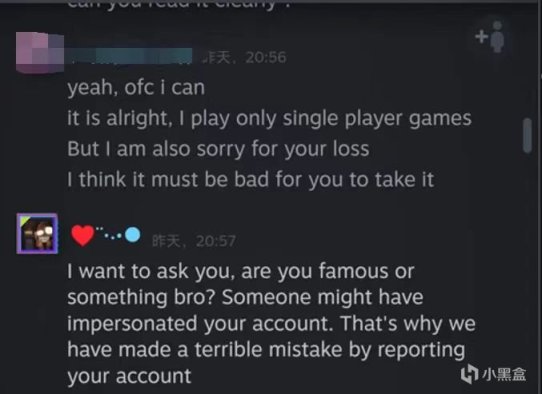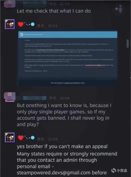 当时我的 Steam 账号是正常状态,没有收到任何的红信警告,理论上非常安全。但我又转念一想,按照 V 社的惯常做法,虽然所有对于账户的封禁都会通过 Steam 客户端内的通知栏进行传递,但是这个偶尔会有一定程度的延迟,也就是所谓的“秋后算账”。我担忧自己的封禁没有即时生效,因此向这位陌生人询问事情进展。