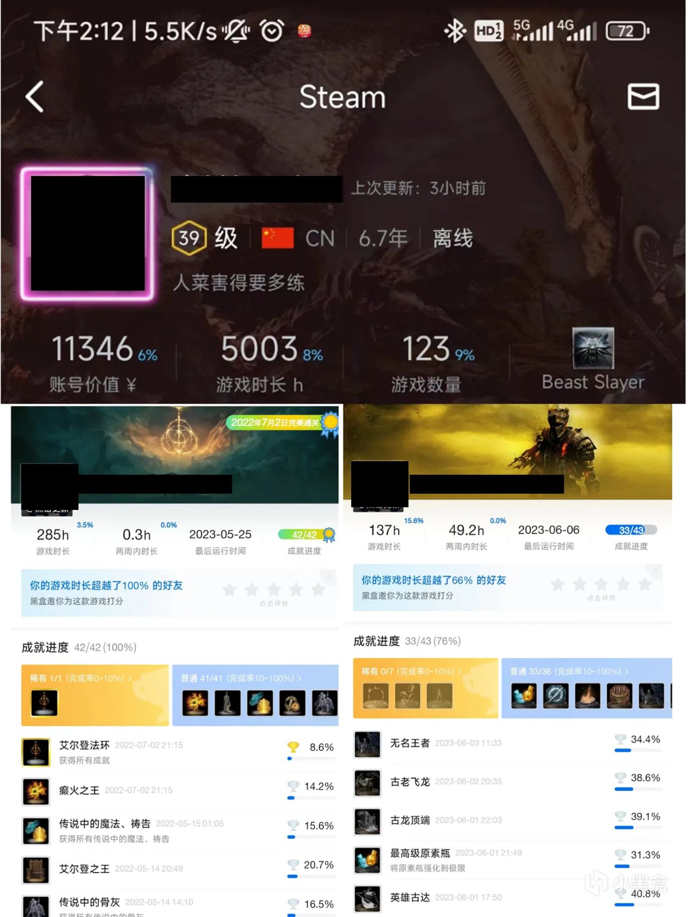 我是其中之一。尽管我的 Steam 账号价值不高,但是上面有着大量我足以自豪很久的回忆,比如《艾尔登法环》的全成就,玩《黑暗之魂 3》时自己首次成功打倒沙力万、薪王以及无名王者等。每当我想起这些,一股难以言喻的暖流与勇气就涌上心头,鼓励我振作自己,继续积极地直面生活中的困难与挫折。