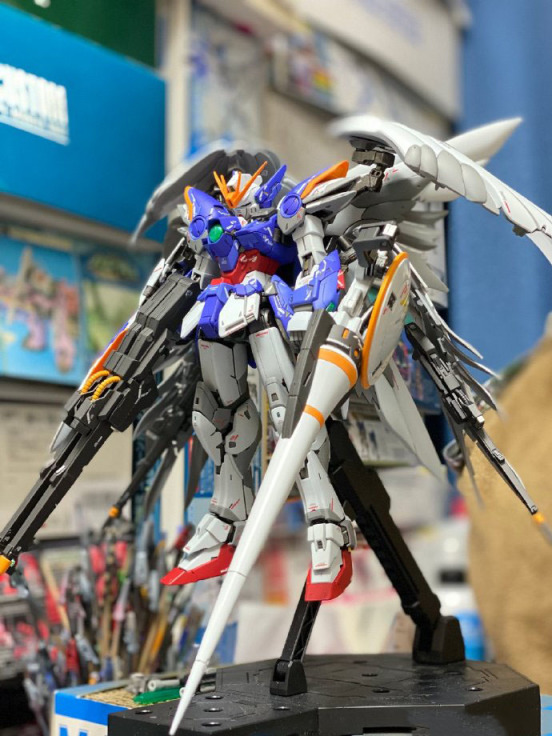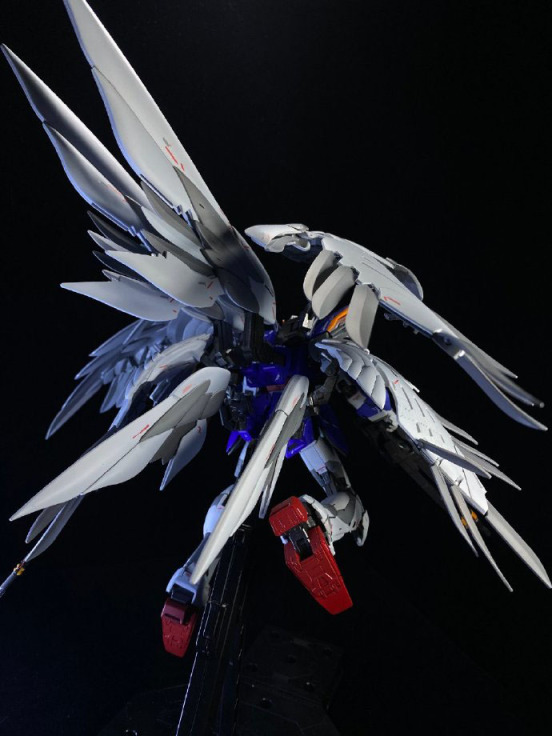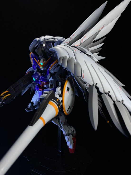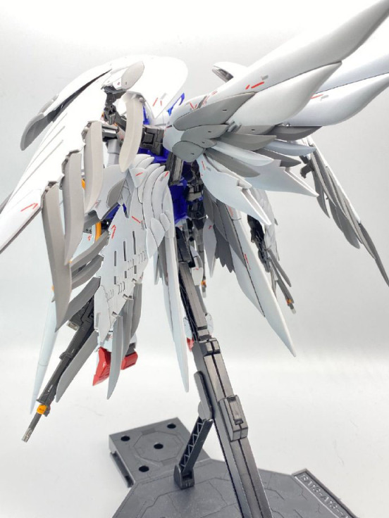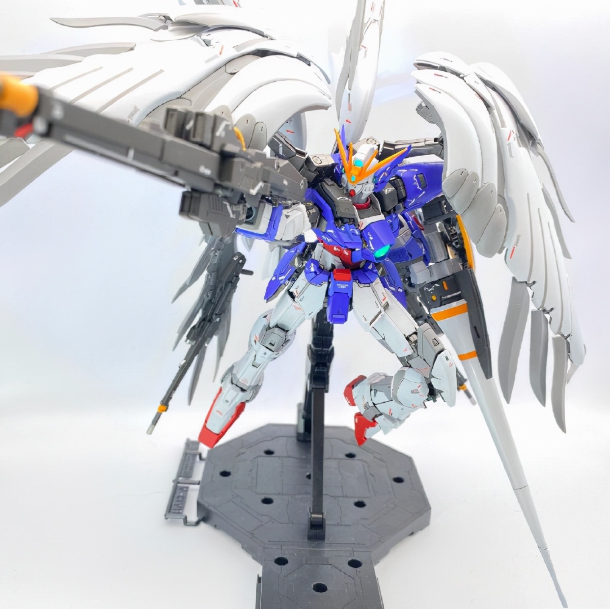 模友使用的是MG卡板的飛翼高達模型進行了全新的塗裝,塗裝之後的效果提升了整體模型的質感,該有的細節分色都用塗裝進行了還原。外甲部分進行了水貼粘貼,細節有很大的提升,翅膀揹包重塗之後非常的漂亮。