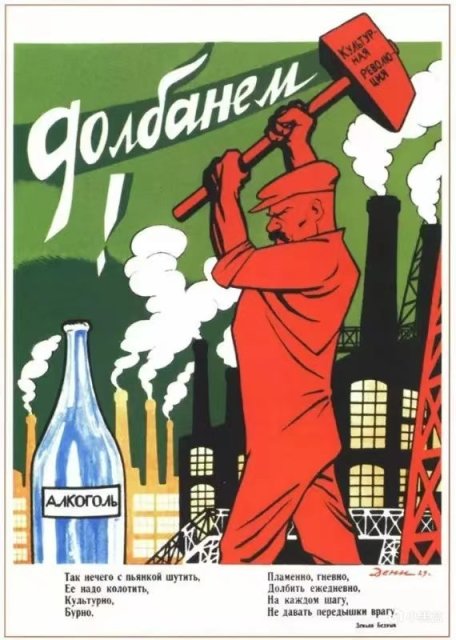 儘管都相繼出臺法律法規,成立多個反酗酒委員會宣傳飲酒危害,對過度酗酒者實施勞動教養等等,但是赫魯曉夫、勃列日涅夫執政時期的禁酒措施依然成效甚微。很有意思的是同時期蘇聯的禁酒海報憑藉簡單直白的話語、大膽醒目的設計、蘊含的蘇聯美學價值,令人印象深刻,到了現代還被彙編成冊供人蔘考欣賞,在遊戲《原子之心》中我們也能看到相似的禁酒海報。