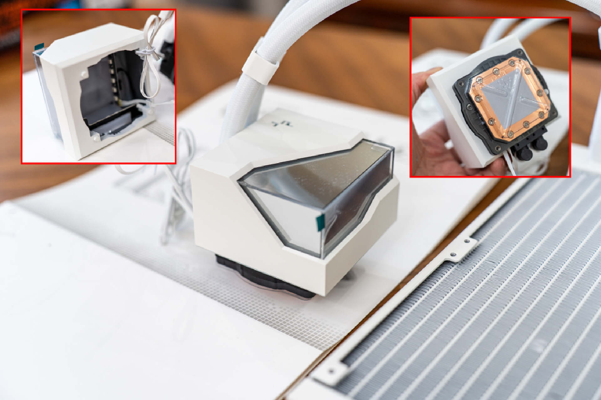▼水冷的外殼和主體都採用的磁吸設計,安裝起來格外便利。水冷頭底部爲全紫銅,出廠預塗硅脂,透明外殼包裹避免了忘撕保護膜的“翻車”事件。內部搭載自研第四代高性能水泵,三相六極內繞馬達,最高轉速可達 3100RPM,陶瓷軸承軸心,不僅散熱能力強悍,壽命也大幅提高。