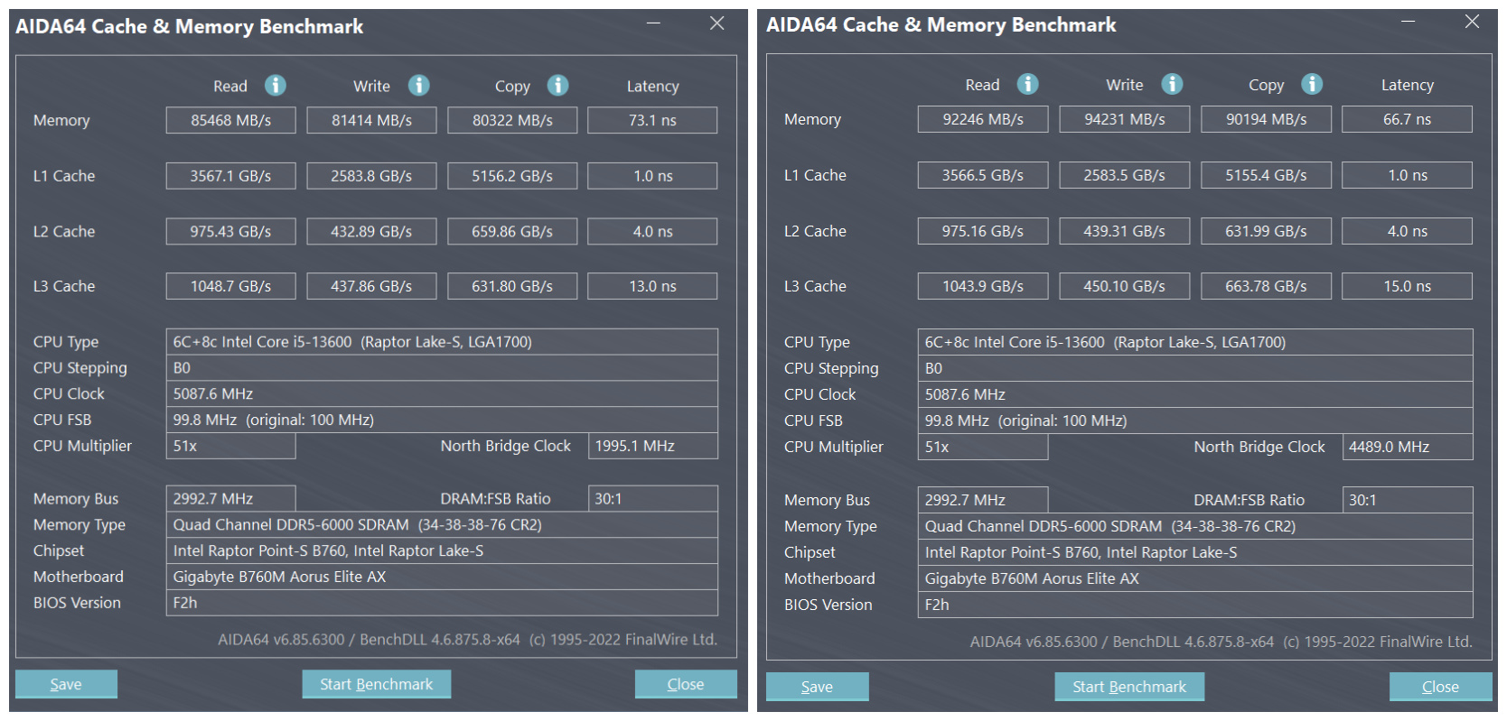 ▼分別測試普通模式和黑科技模式,測試環境爲預設XMP 6000MHz @ 時序 34-38-38-76。結果如下: