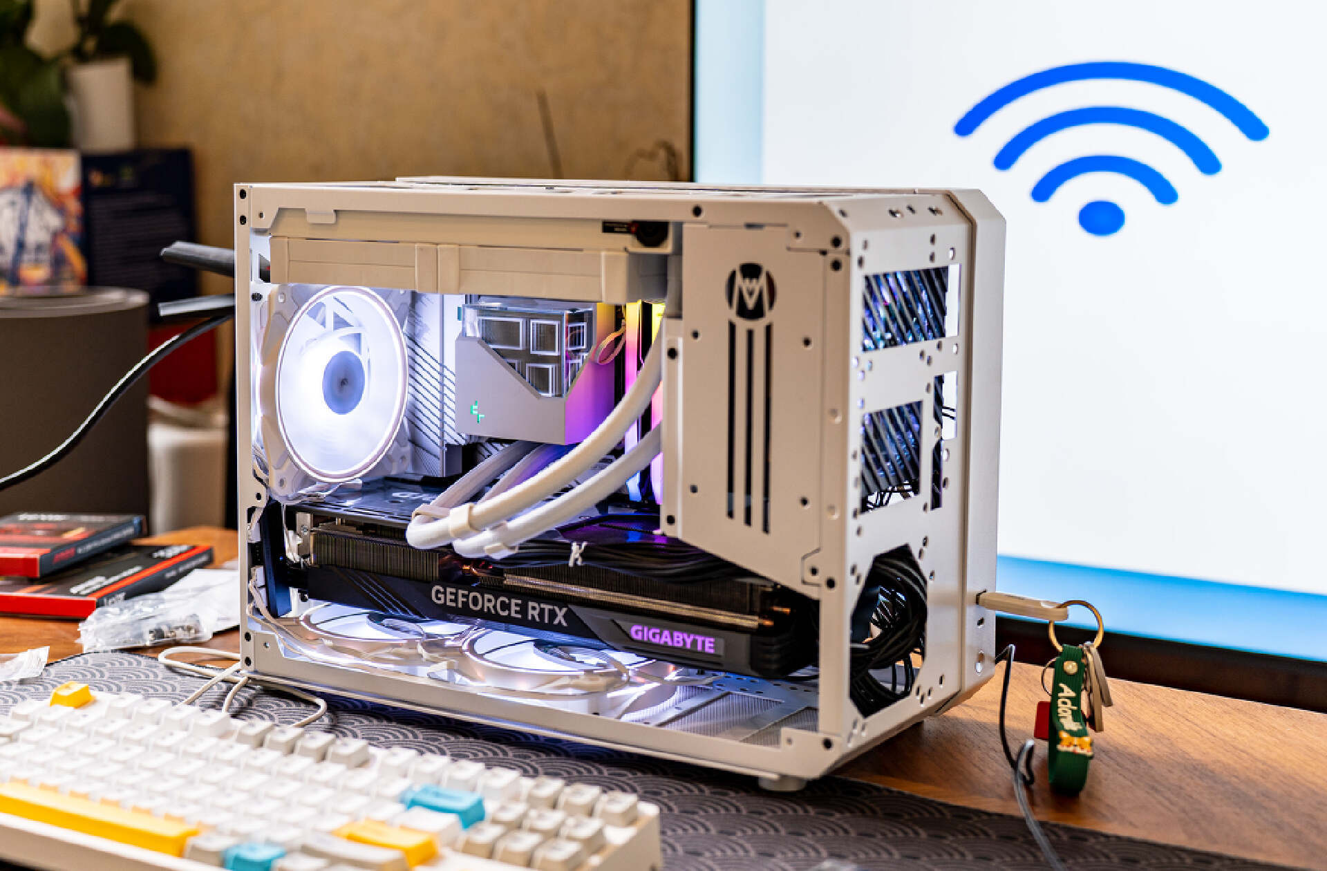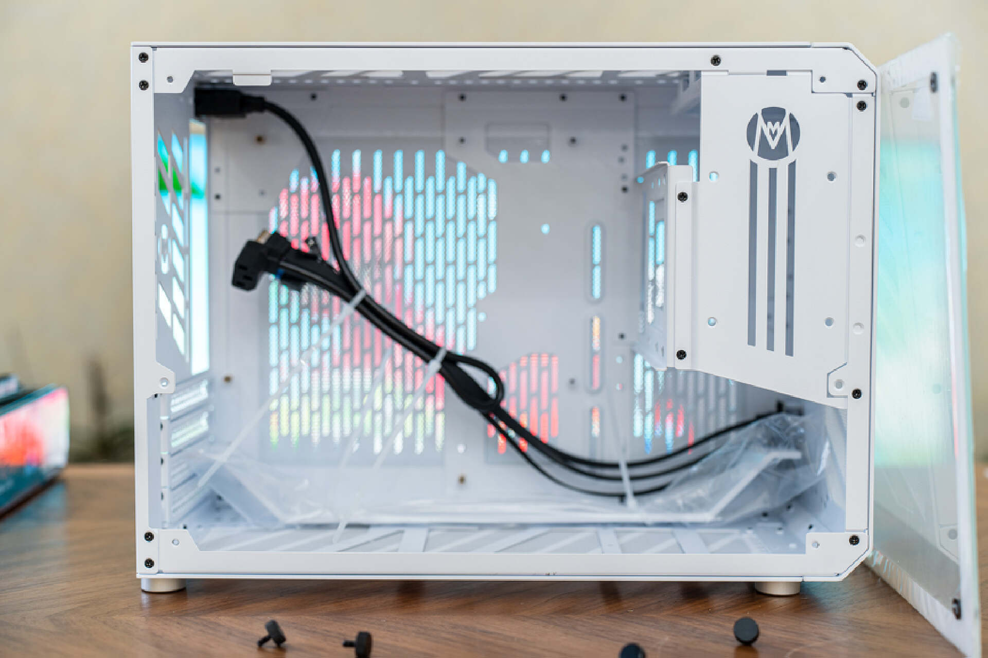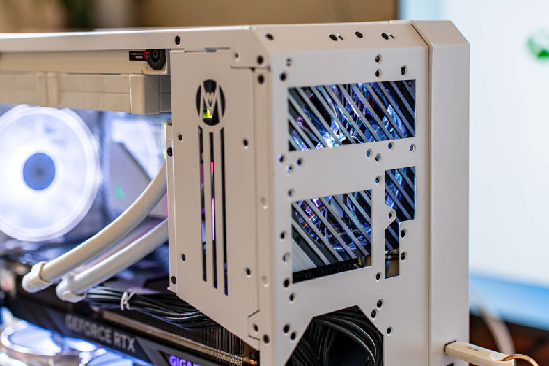 ▼機箱是機械大師 C+ max,鋁合金機身顏值超高,關鍵是體積極致緊湊,不僅能上水冷和 40 系顯卡,還有多餘的位置裝機箱風扇和硬盤,自帶提手方便移動。除了價格和螺絲多就沒啥缺點了。