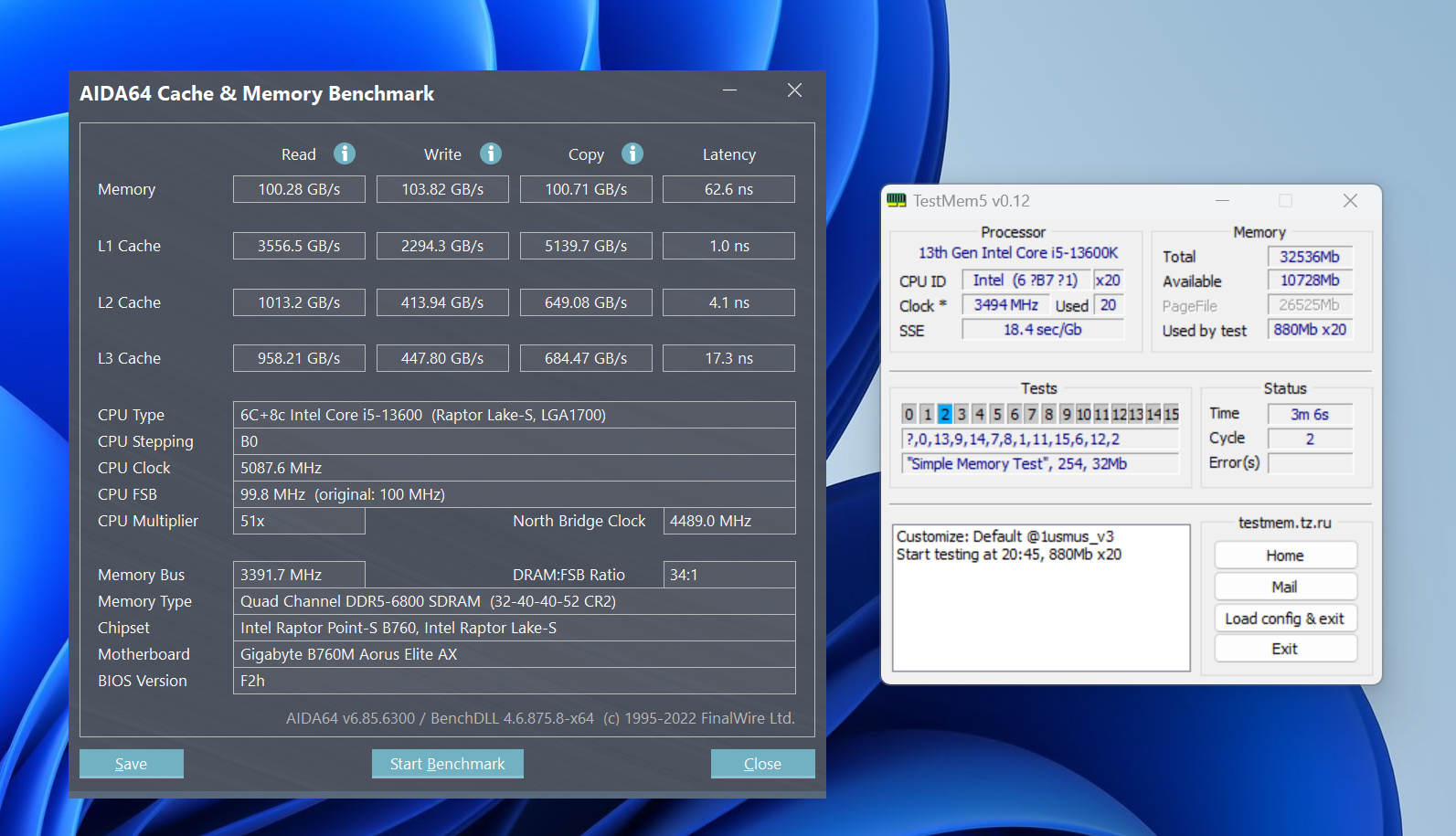 ▼雷克沙 Ares 戰神 DDR 採用的海力士 M -Die 超頻顆粒,不僅預設時序低,超頻性能也很不錯,我簡單嘗試了下就將其超頻至 6800MHz ,時序調整爲 32-40-40-52,搭配技嘉的超頻黑科技直接衝上了百 G 大關,延遲壓到了 62ns(TM5 壓測正常通過),結果如下: