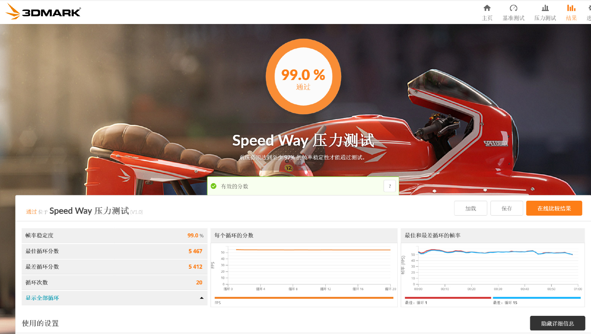 ▼3DMark 壓力測試通過率 98.9%。室溫 24°C 的情況下,CPU溫度在 68-78°中間,顯卡溫度在72°左右,總體來說比較穩定。