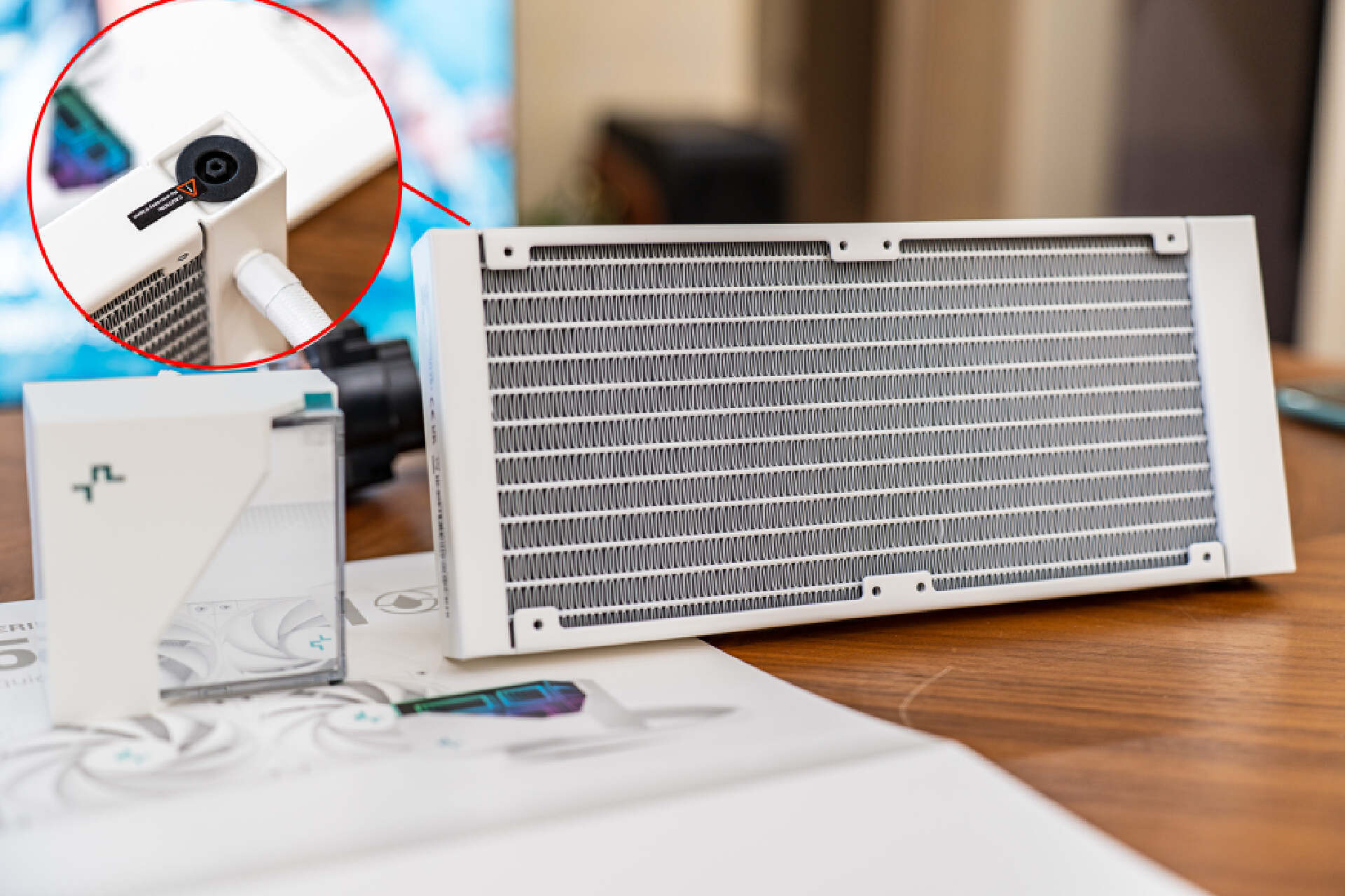 ▼冷排採用了全鋁材質,表面的噴塗工藝手感細膩,鰭片排列整齊,彎折邊角也井井有條,工藝堪稱精細,質感也比較到位。冷排搭載了九州風神自家的動平衡泄壓技術,邊緣設計了泄壓囊釋放內部壓力,延長使用壽命。