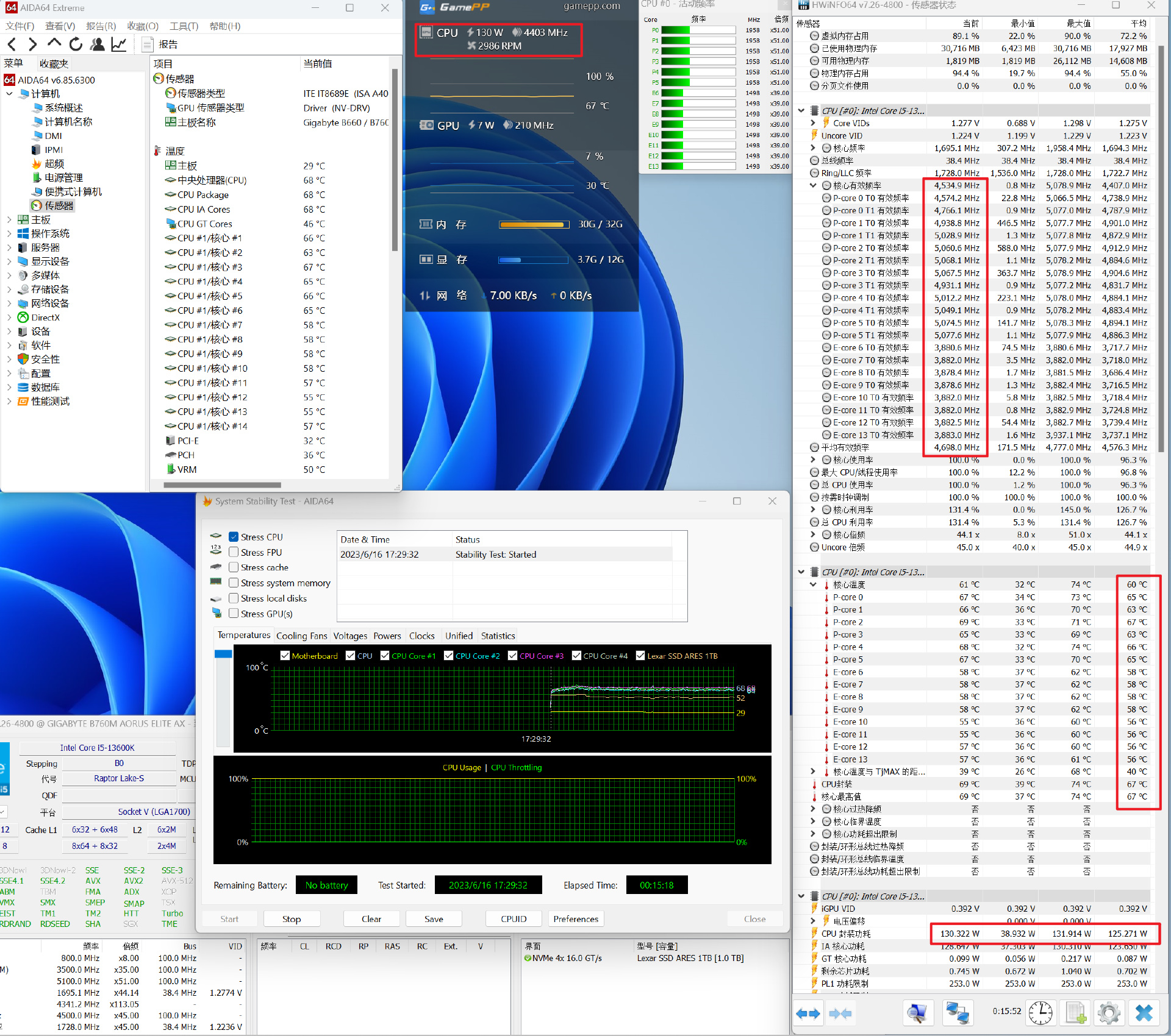 ▼單烤 CPU 15分鐘,大核運行頻率達到 5.1Ghz,小核也跑到了 3.8Ghz,此時 CPU 平均溫度 60°C,可以說被冰魔方壓得死死的。