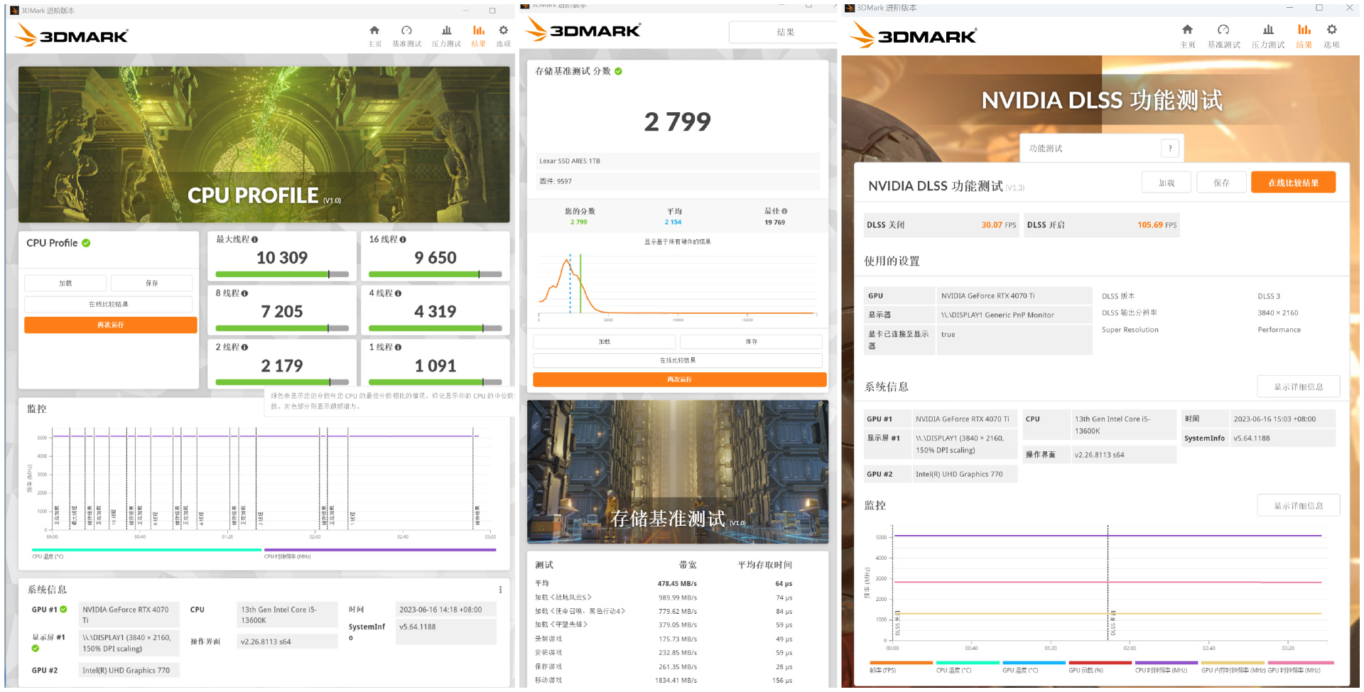 ▼此外, 3DMark 還運行了針對處理器 CPU 基準測試 【CPU Profile】、針對 SSD 性能【存儲基準測試】、測試 DLSS 性能和圖像質量的【NVIDIA DLSS功能測試】,結果如下