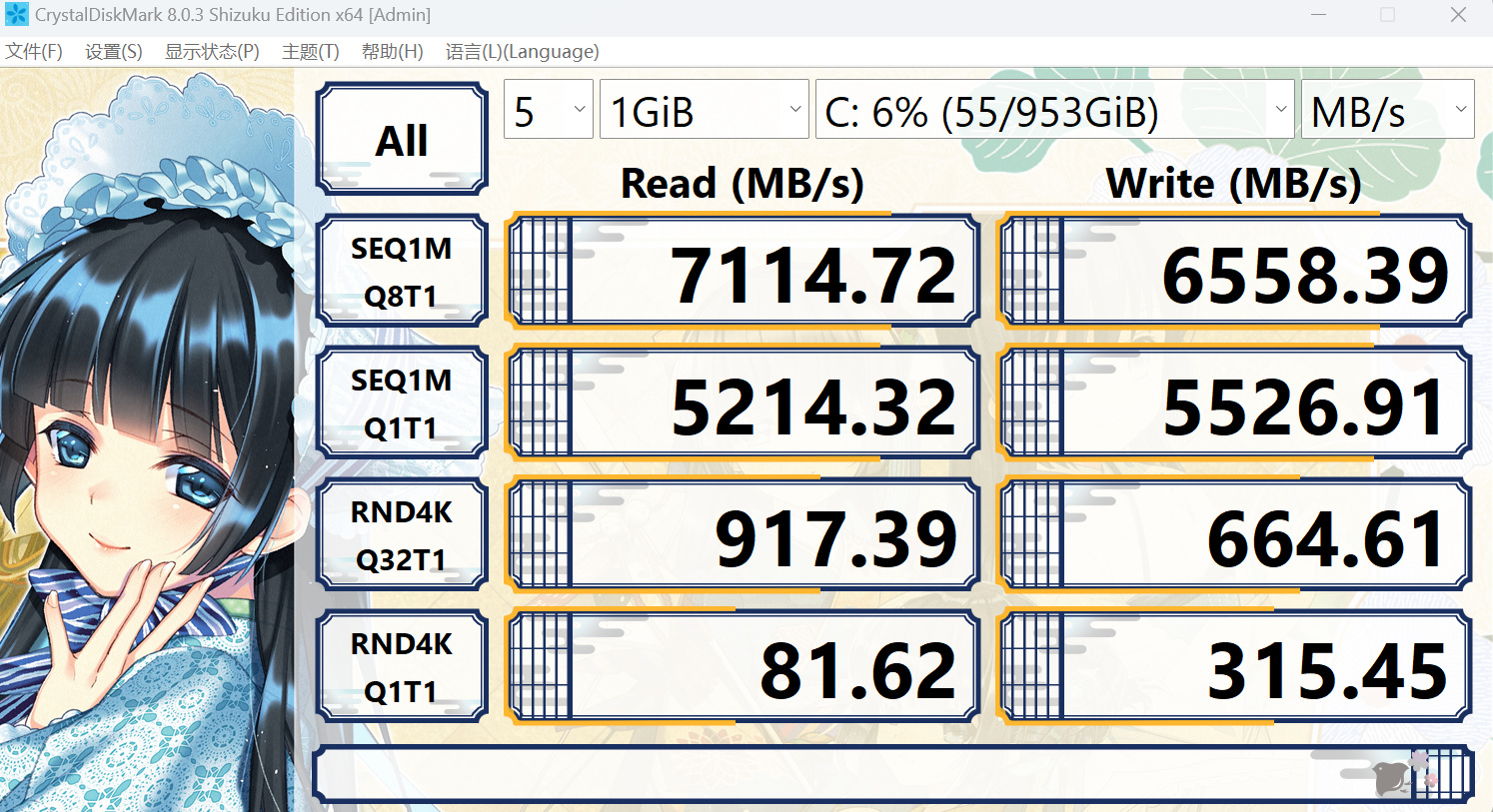 ▼利用 CrystalDiskMark 測試雷克沙 Ares 戰神的性能,順序讀取 / 寫入分別爲 7115MB/s、6558MB/s,對於日常使用體驗有較大影響的 4K QD1 隨機讀寫分別爲 82MB/s、315MB/s,合乎官方數據。