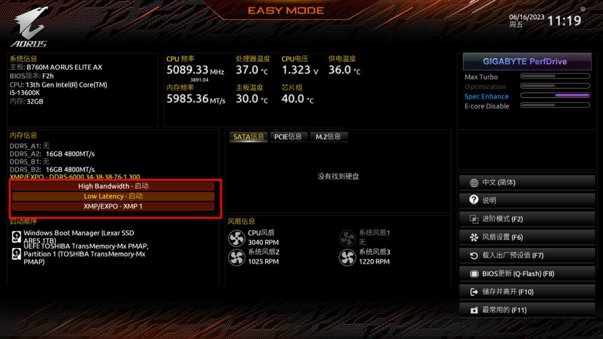 ▼內存性能測試。技嘉 DDR5 主板搭載的“高帶寬低延時”黑科技對於內存提升有很大影響,在 BIOS 中可以開啓對應功能,如下圖所示