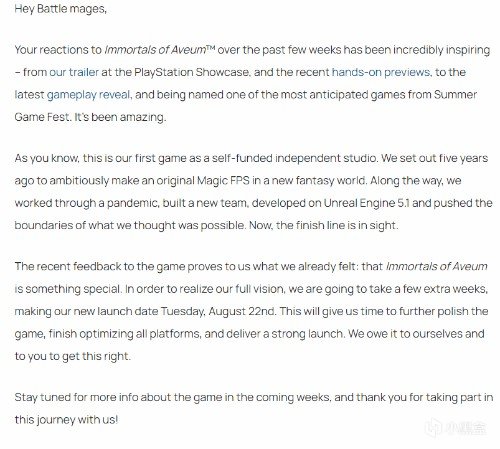 EA魔法射击游戏《不朽者传奇》宣布跳票1个月,声称为了确保发售质量。今日,EA正式宣布,魔法射击游戏《不朽者传奇》计划推迟原定发售日7月20日至8月22日。开发商游戏总监Bret Robbins表示,延期一个月是为了给团队有更多充足时间微调游戏,进一步优化游戏在PS5、Xbox Series X|S和PC平台上的表现,以下是声明原文