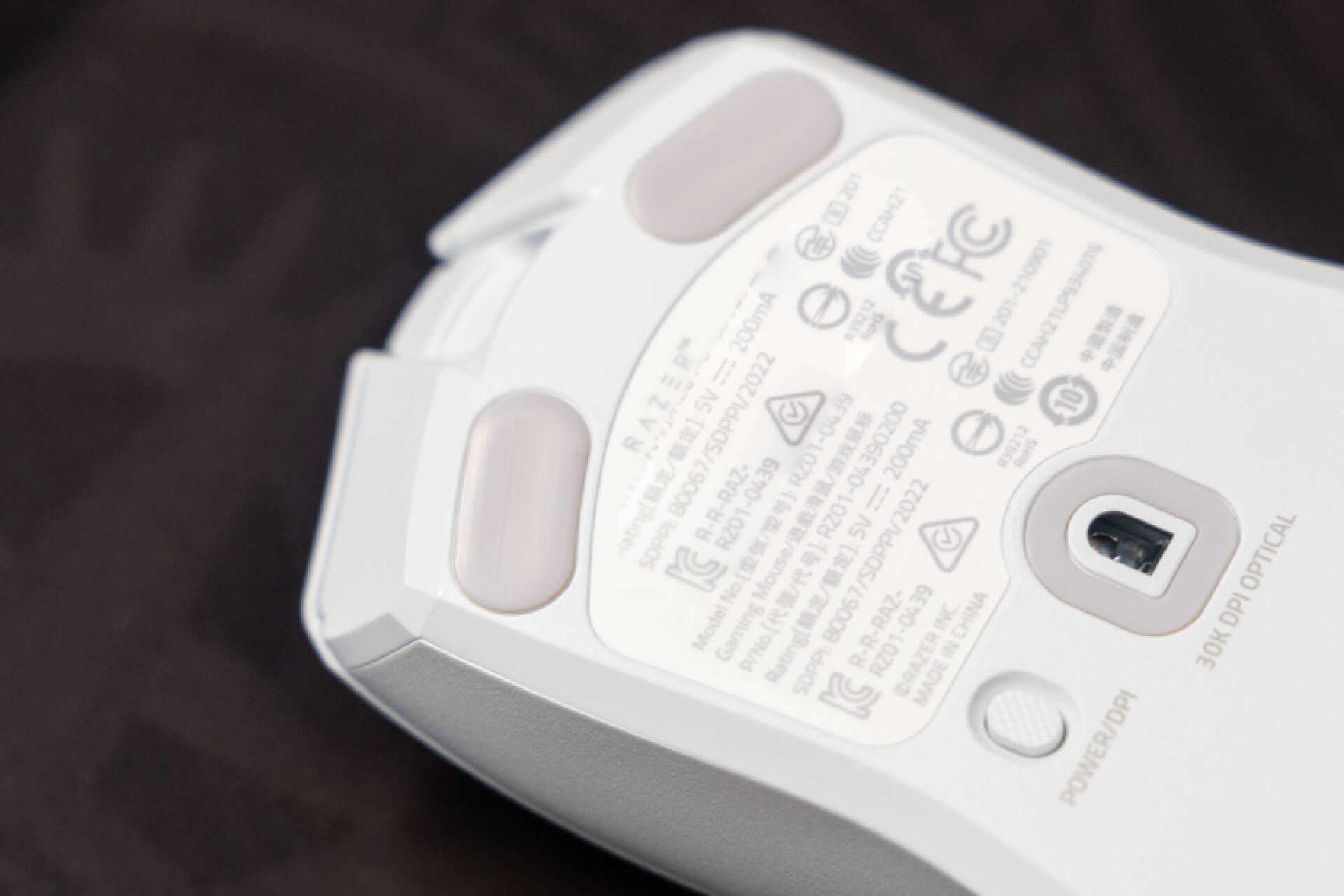 鼠标的底部采用五点式脚贴布局,中置引擎,在引擎侧边设置了一枚多功能按键,用于CPI切换与电源开关。