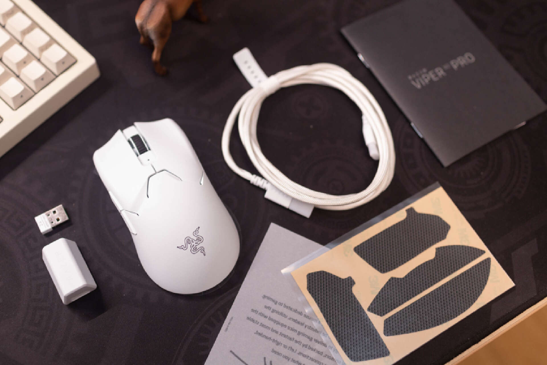 毒蝰V2 Pro的配件相当丰富,包含鼠标,数据线,2.4G接收器,延长底座,说明书质保卡,雷蛇标识贴纸以及一组专用防滑胶贴。玩家在使用习惯,个性化装饰方面的需求都能一次性满足。