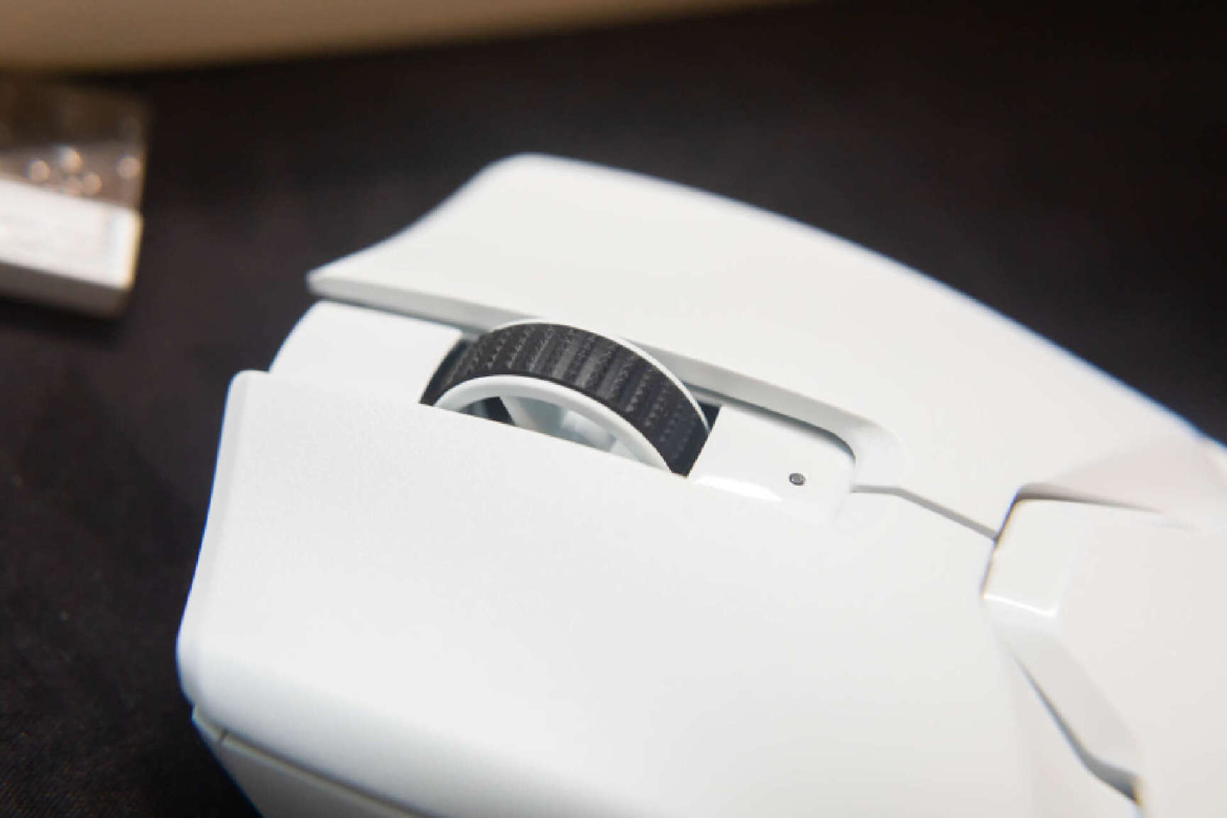 鼠标的滚轮采用了镂空设计,表面覆盖轮胎纹的胶条,使用时段落感清晰。