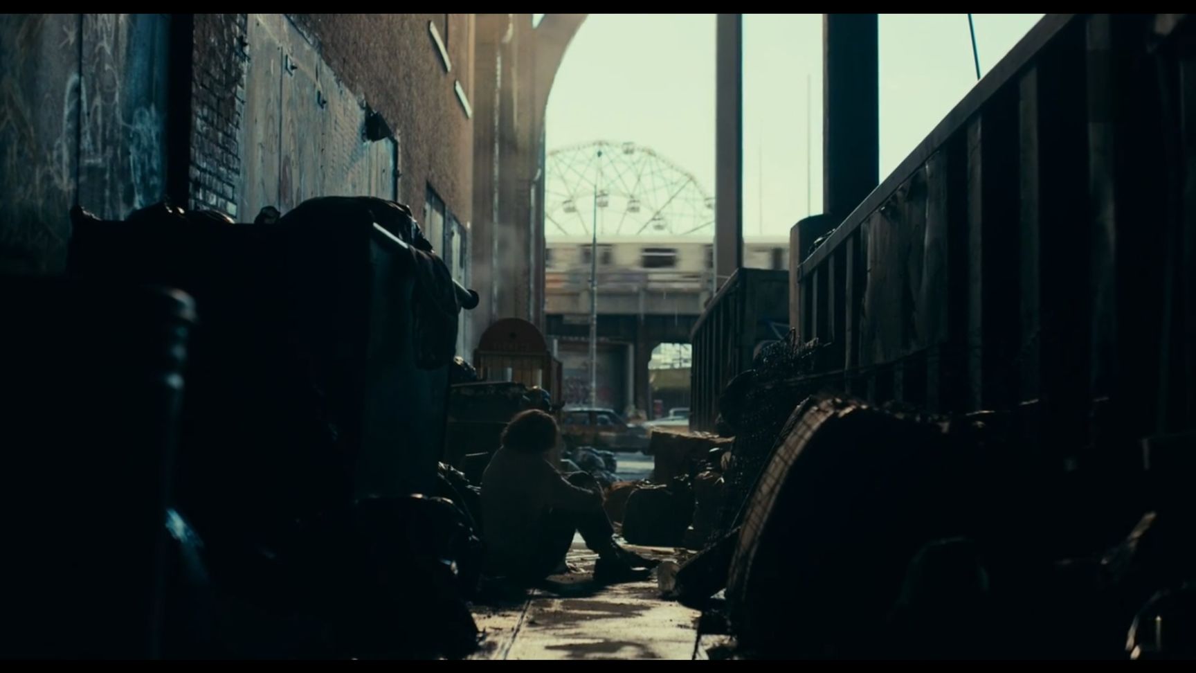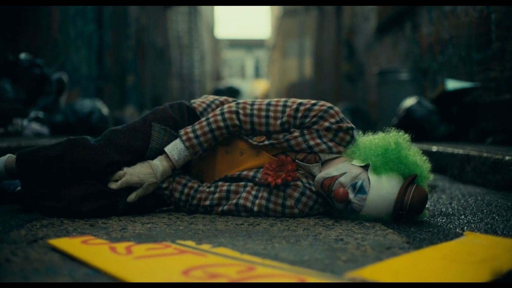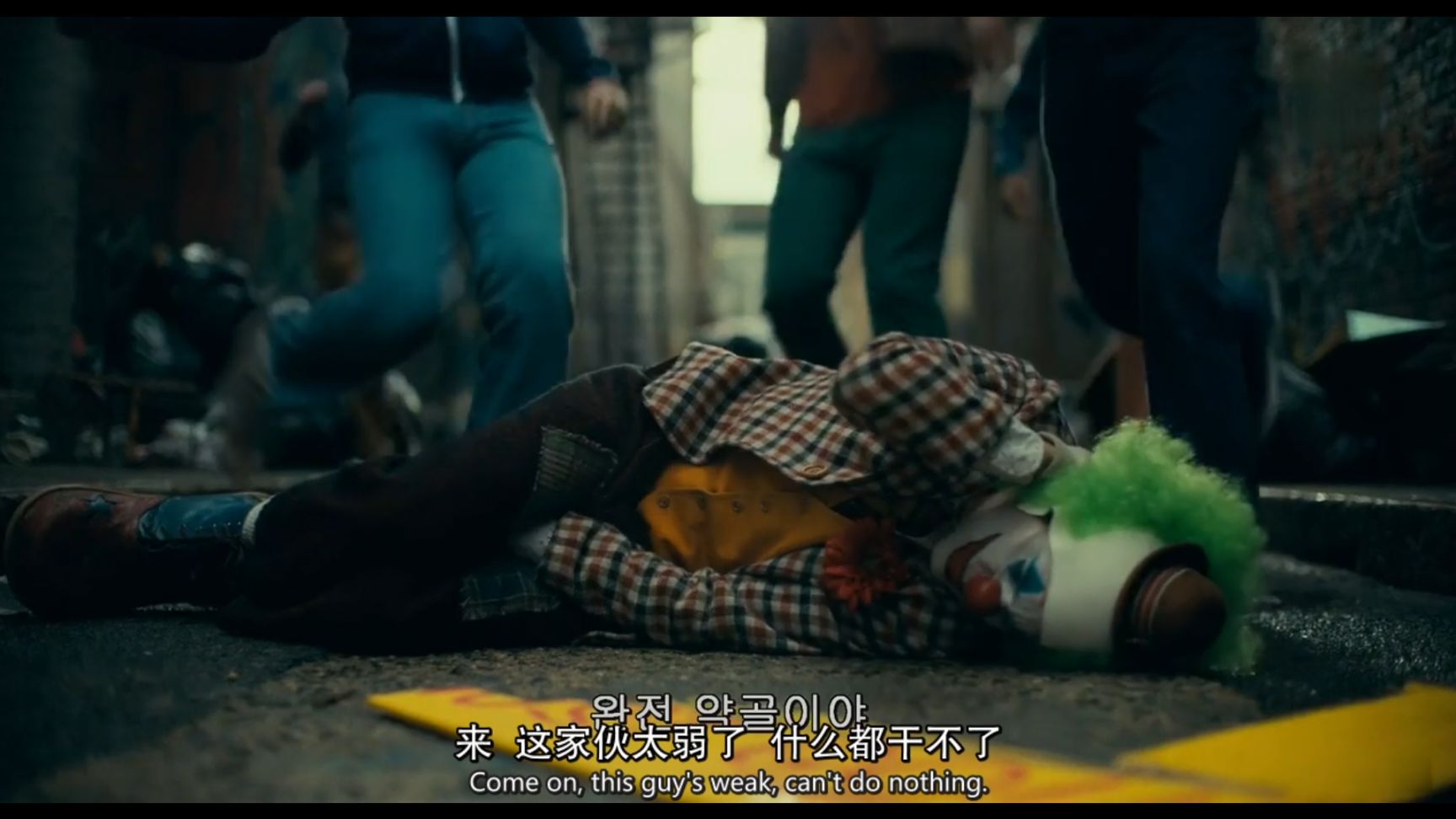 在街頭,亞瑟扮演着小丑,爲一個快倒閉的琴行拉生意,結果卻被一羣未成年的小混混戲弄毆打。