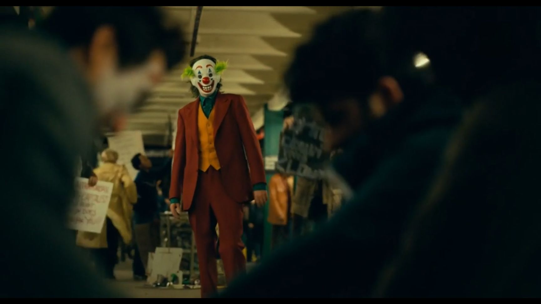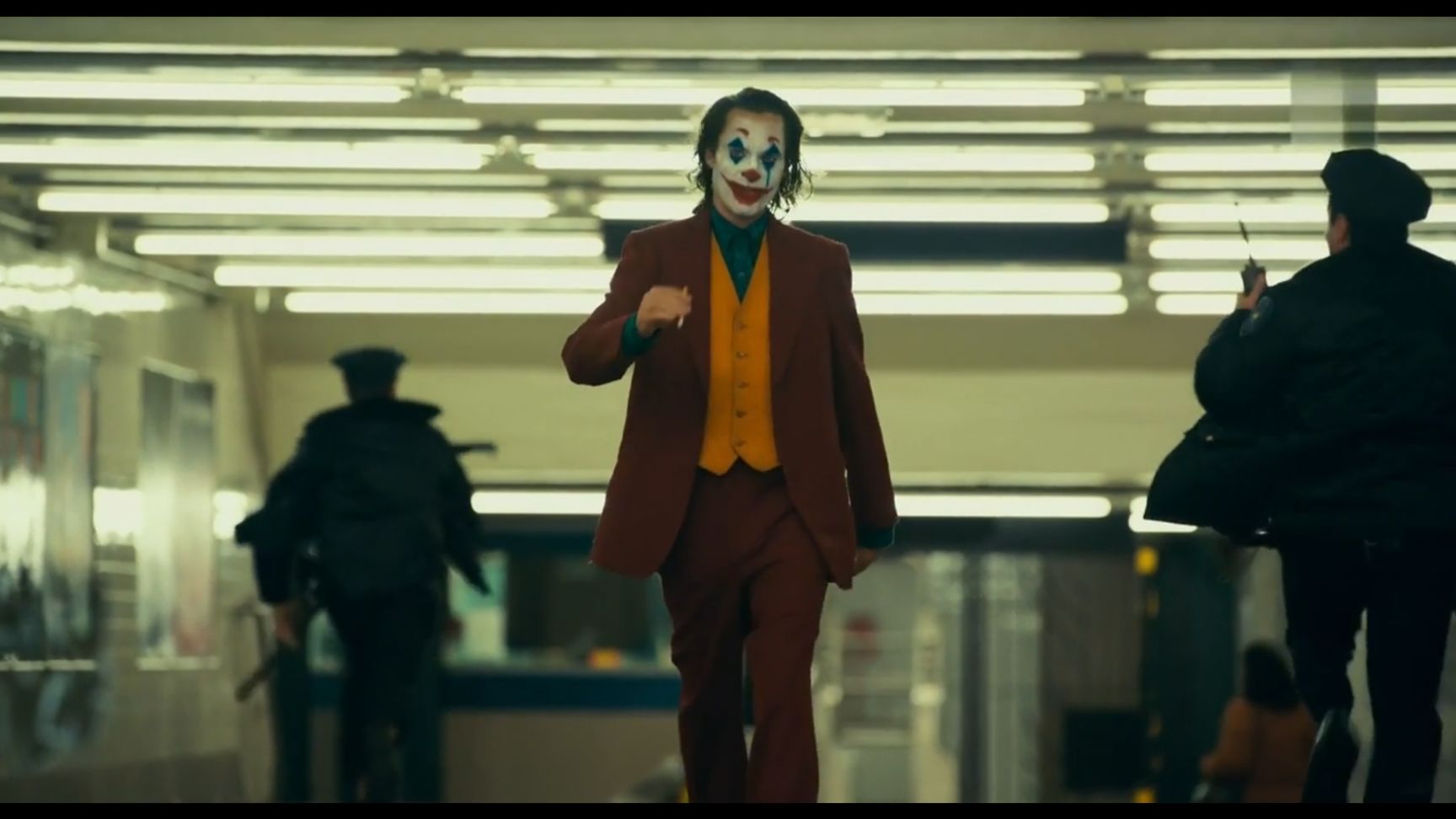 重新化妝後,亞瑟穿上紅色西裝和綠色內襯,將臉化成小丑模樣,在離開家門時,伴隨着歡快的音樂,在樓梯上肆意舞蹈,可警探如影隨形,亞瑟在地鐵上將他們甩開,此時正是小丑幫們準備組織的遊行集會,地鐵上滿是小丑,在警探的追捕過程中,他們失手扣動扳機,將路人擊倒,隨後他們被整個地鐵的人圍毆,亞瑟逃了出來,兩名警探生命垂危。