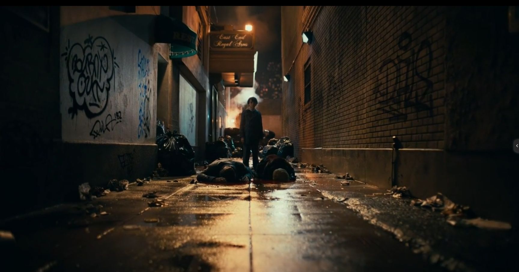 此時此刻,在一家電影院的小巷裏,托馬斯韋恩正帶着妻子和孩子逃跑,而身後傳來了呼喊他的聲音,他轉過身,看見一個帶着小丑面具的人正拿着槍對着他,然後他開槍,布魯斯韋恩的父母全部被殺死,父母血淋淋的屍體倒在布魯斯的眼前。