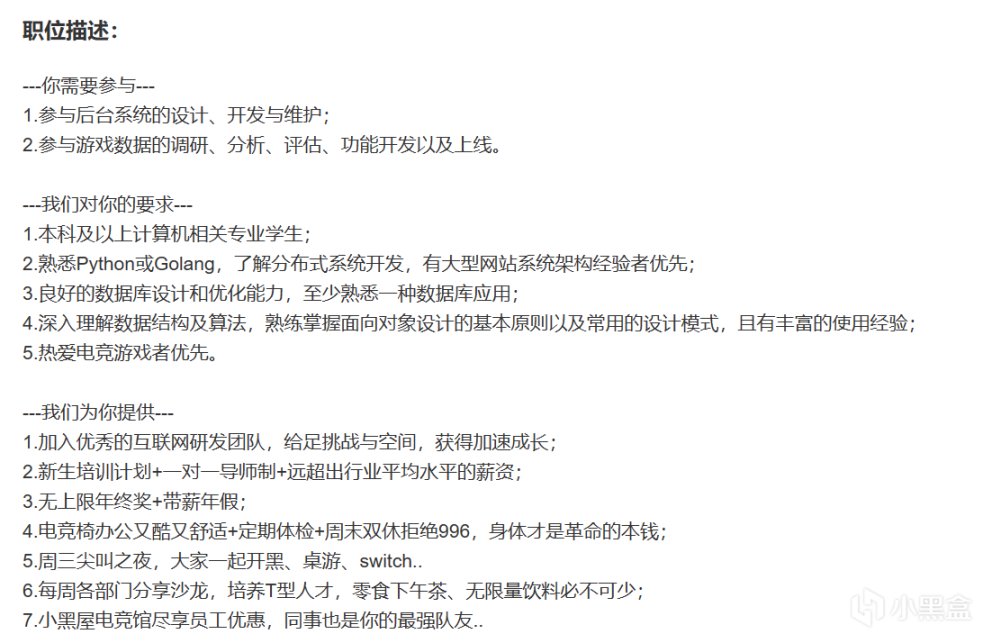 以下是小黑盒的後端開發崗位,對應屆生招聘