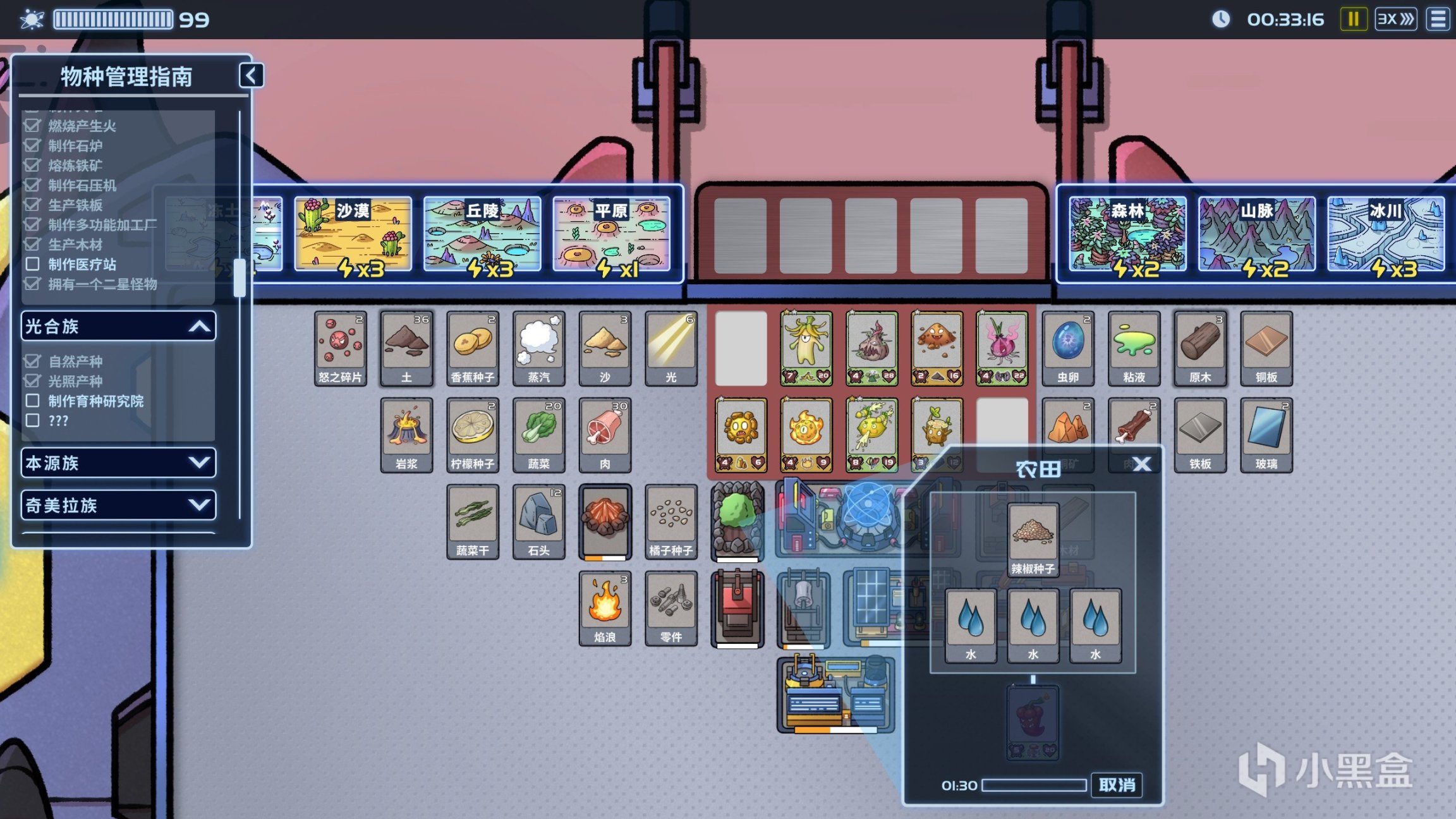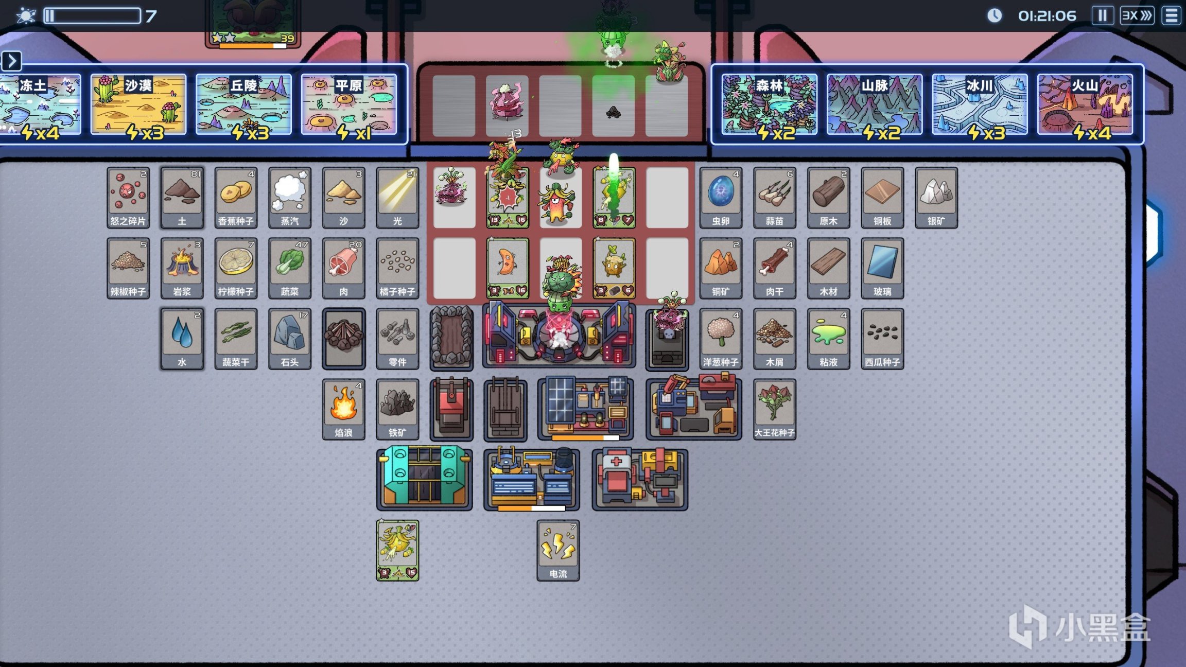 在这样的玩法上,游戏又添加了资源探索玩法,就是你一切一切的行动都是需要各种资源的,比如你想要种植出新的植物,你就得收集资源建造农田,然后再收集种植植物所需要的资源,想要融合两种植物你就得收集资源建造育种实验室。游戏内的资源类型可以说是复杂多样了,一种基础资源可能可以变成多种加工资源。
