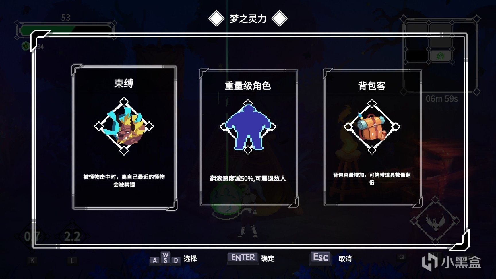 游戏的道具很多,而且很有意思的一点是,你拾取到的道具是没有说明的,只有用了才知道是什么效果。清空当前房间就会有概率掉落道具宝箱,还有概率能够获得天赋加成,天赋可以三选一,天赋似乎是可以无限获取,无固定上限的,因为在玩demo的时候没有替换天赋的选项出现。