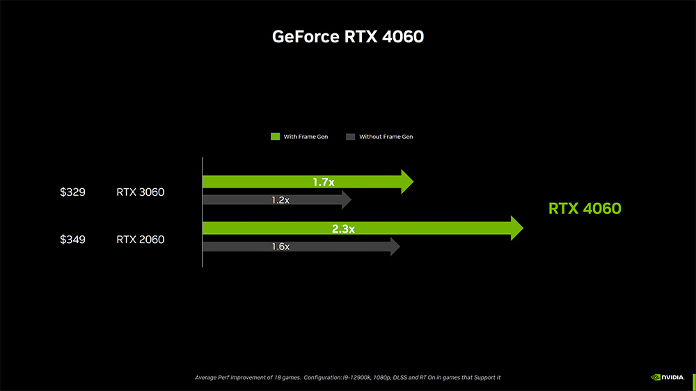 当然,Geekbench 6 这两个成绩不能呈现最后的游戏性能表现,但还是可以作为跟上一代性能差距的参考。下图是 NVIDIA 官方公布的游戏性能平均表现,RTX 4060 比上一代快至少 20%,光追打开的话,差距就拉开到 70%,跟 Geekbench 6 的成绩有段差距:
