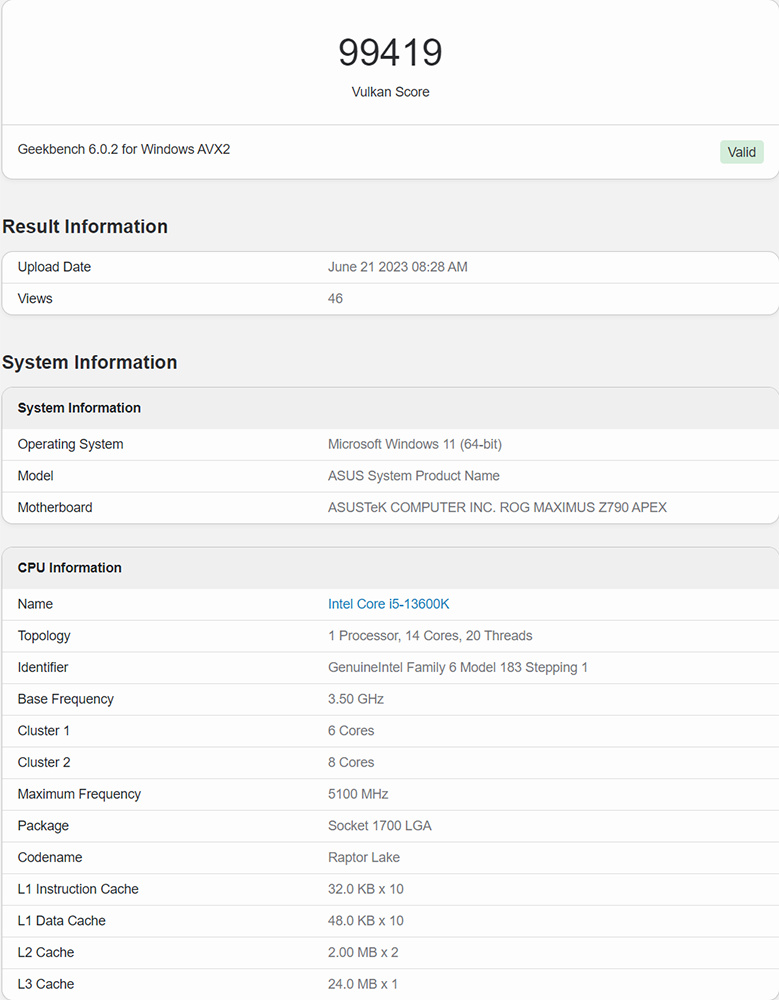 下面二張是首筆 NVIDIA GeForce RTX 4060 的 Geekbench 6 成績,在 Vulkan API 測試中,獲得 99,419 分: