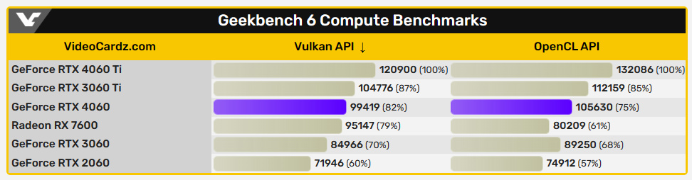 跟上一代 RTX 3060 相比,RTX 4060 的 Vulkan API 高出 12%,OpenCL API 则是 7%,可以看成快 7%~12%。不过很可惜是,这成绩就比 RTX 3060 Ti 还要差,尤其是 OpenCL API,低了 10%。