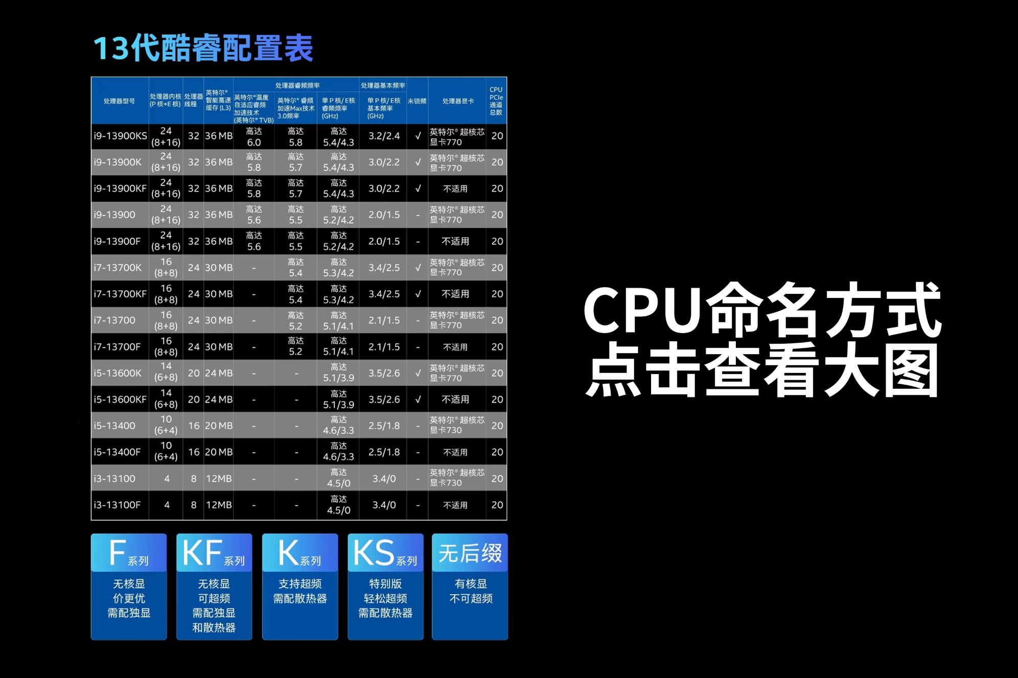 其次是型号,建议选择Intel的可超频型号,命名区分比较简单,桌面级结尾是K/KF/KS这三个的型号均支持手动超频,结尾为F或者无后缀的均不支持超频,移动级CPU同样不支持超频。
