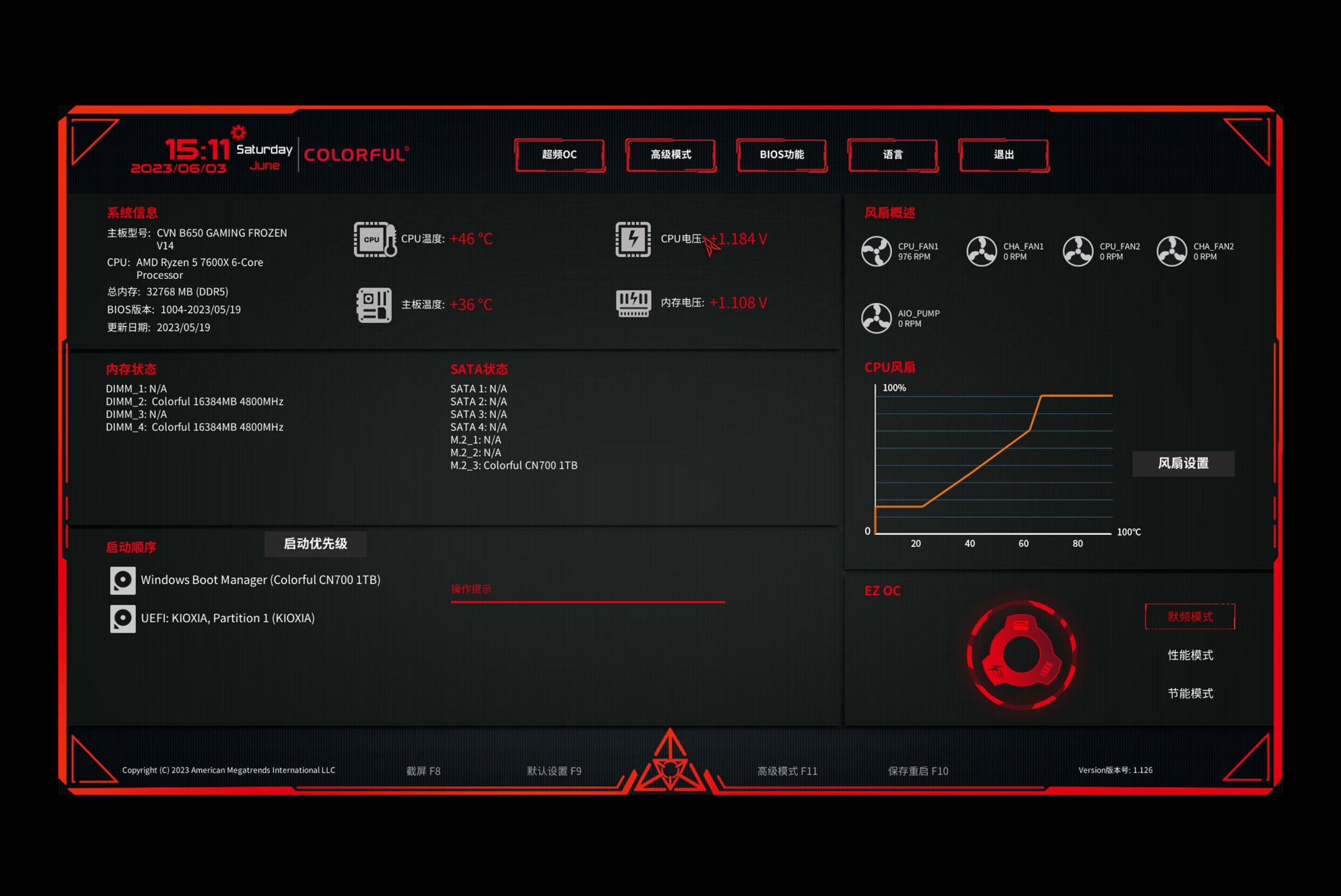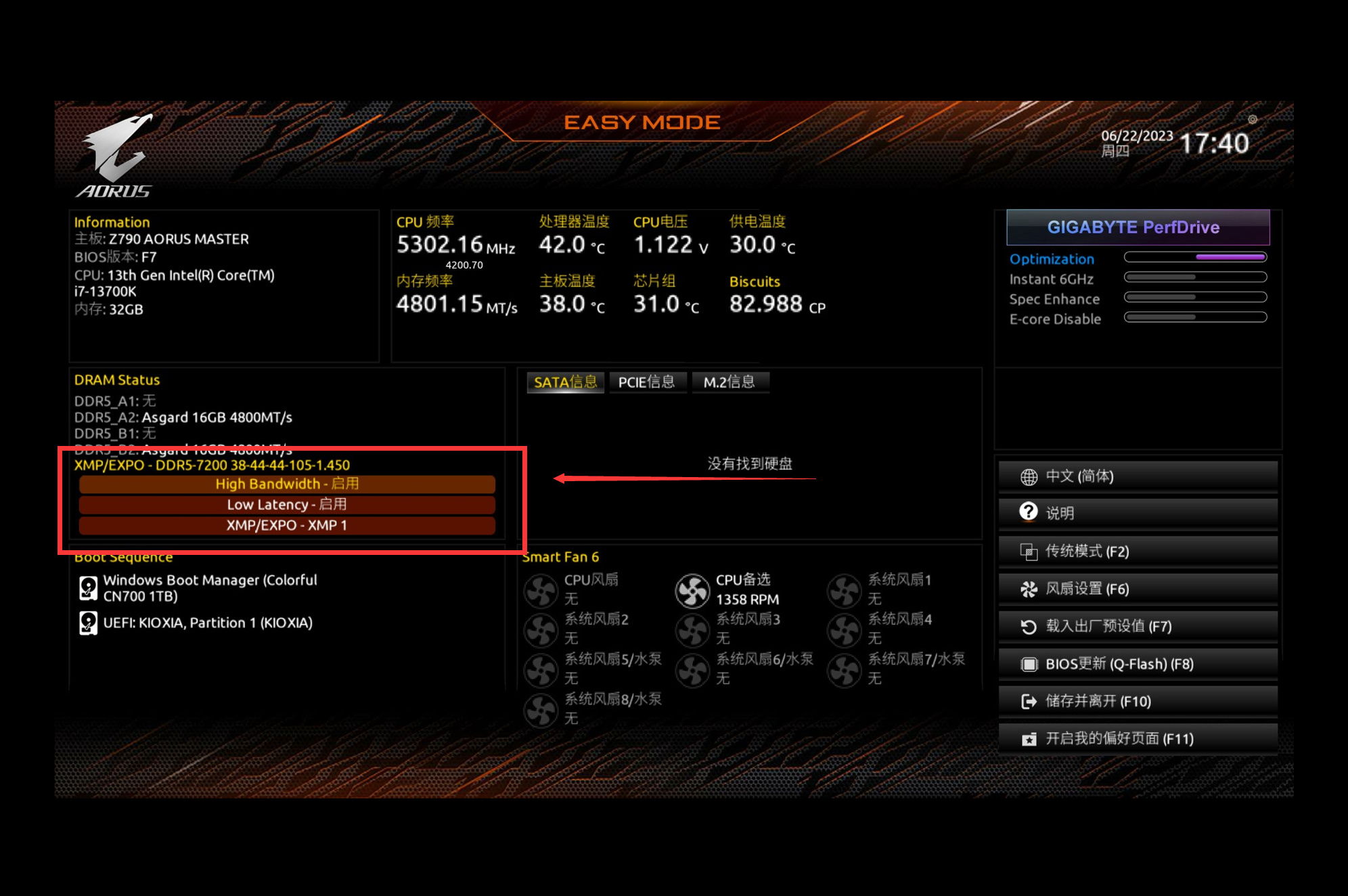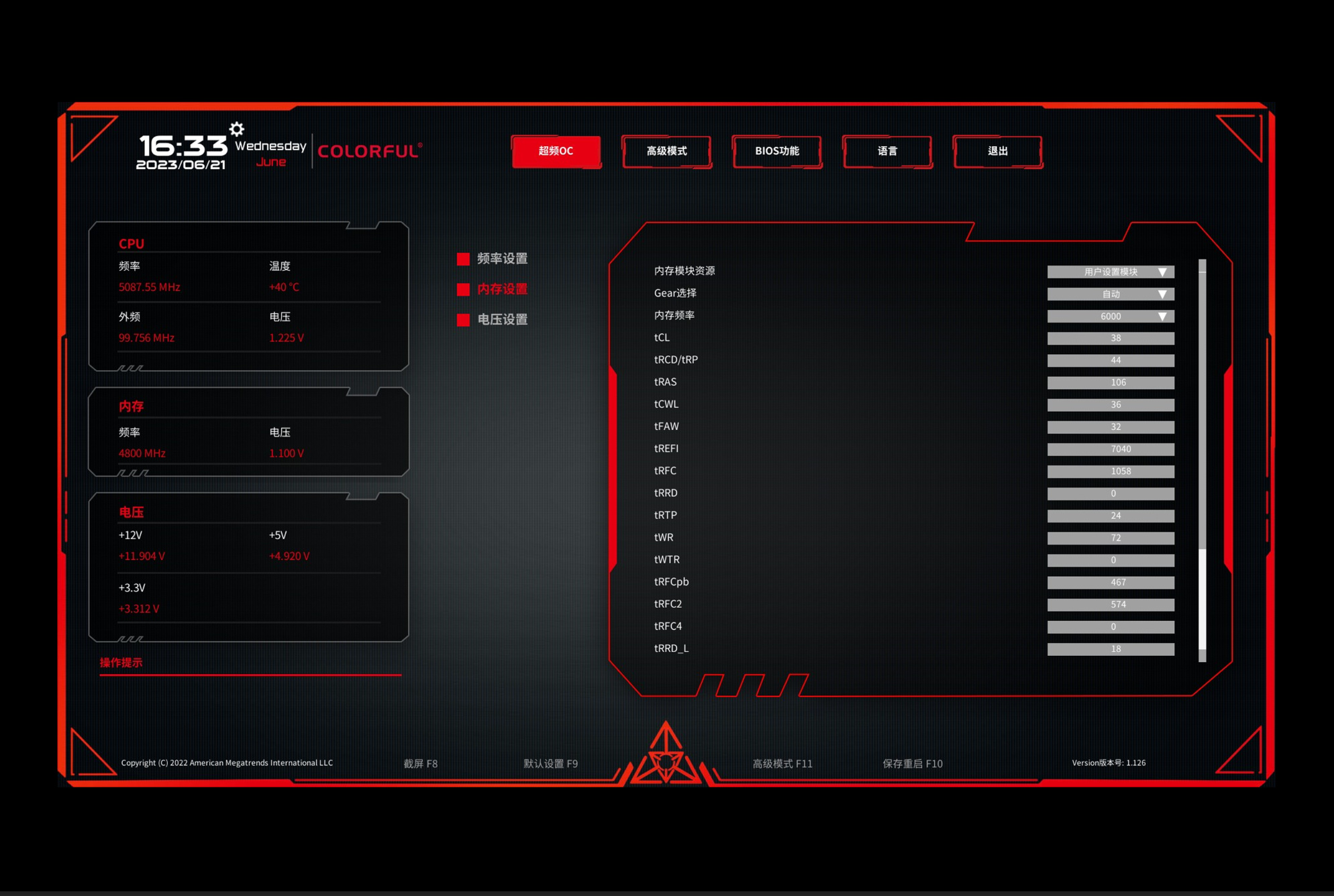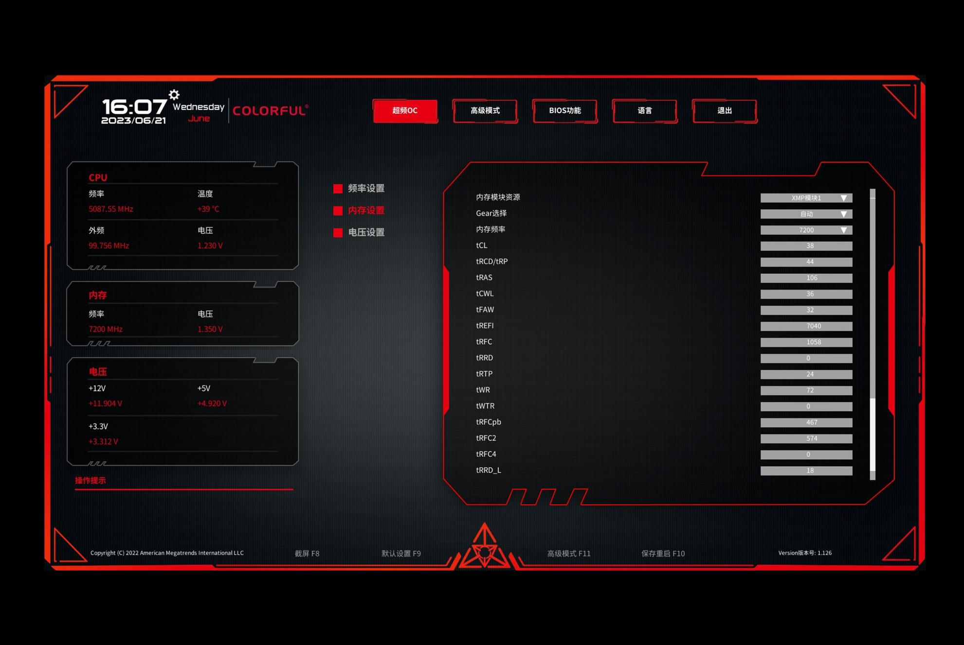 七彩虹的BIOS并没有针对内存做单独优化,所以正常开机进入BIOS,首页找到开启XMP开机即可。