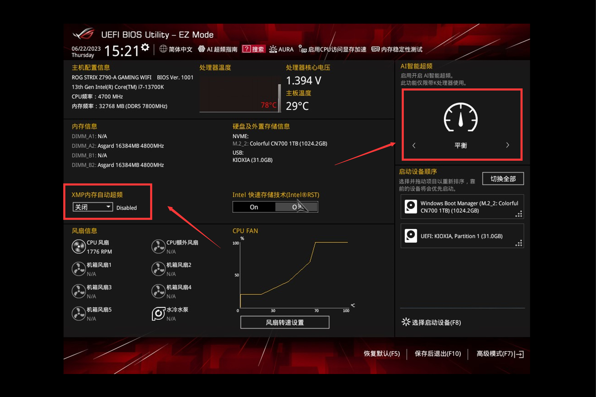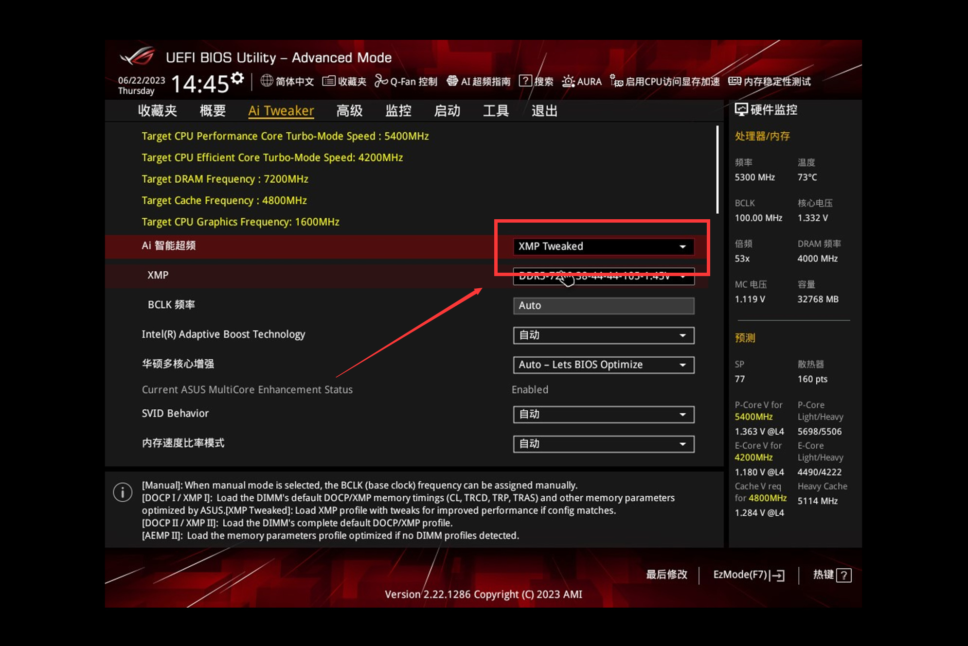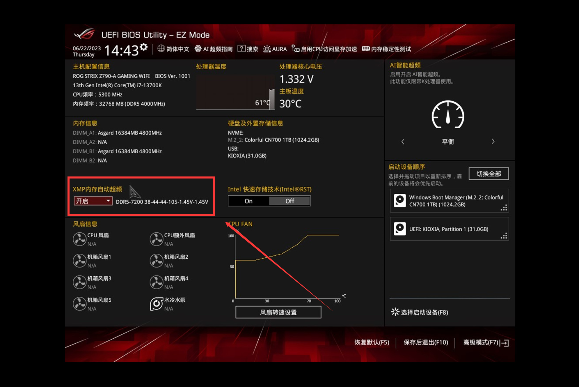 XMP/EXPO切换成内存中最高的配置,现在在售的新款有2-4组预设,一般选XMP1。