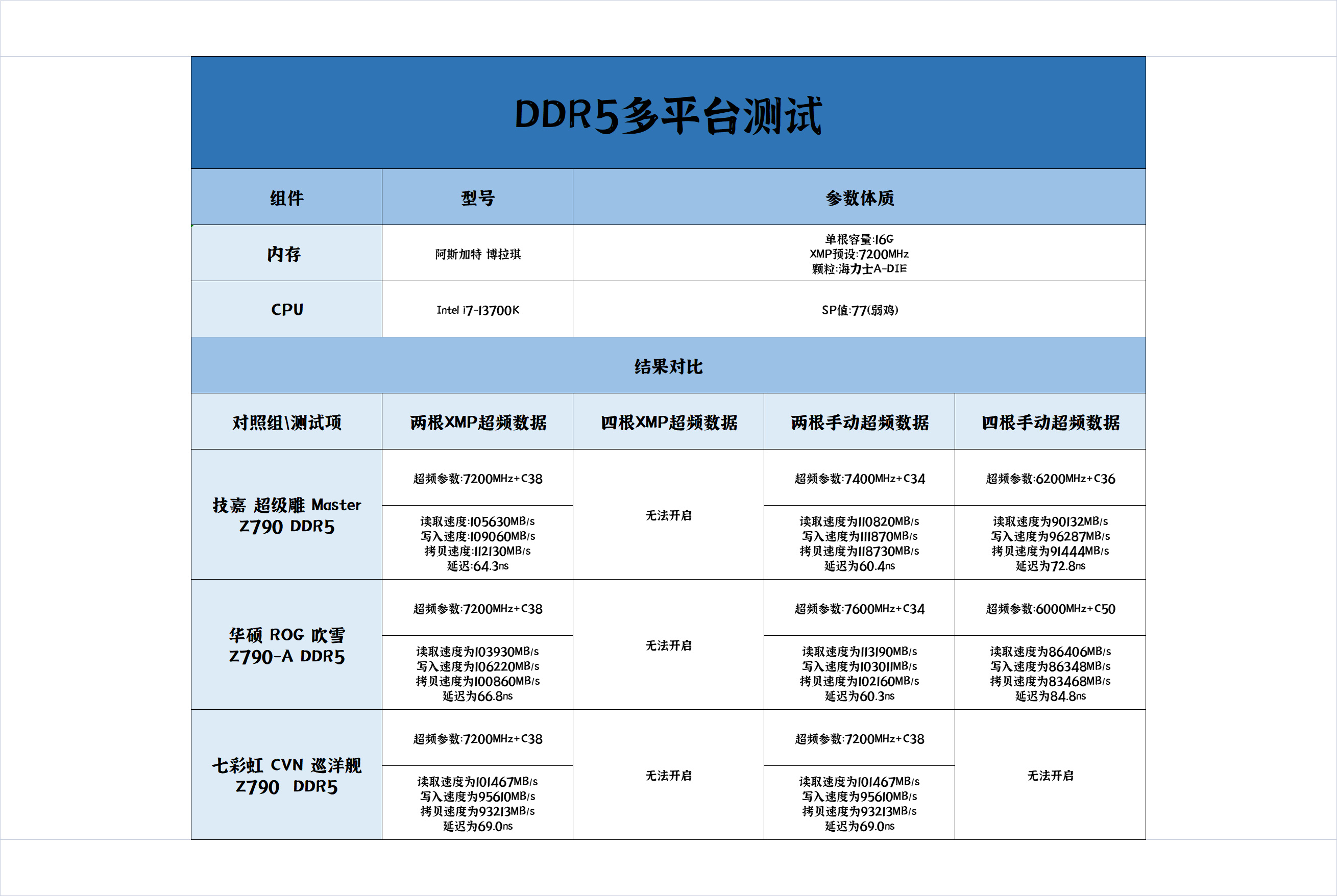 内存手动超频上限同样是不可控因素,XMP/EXPO倒是没啥问题,得出的结论如下: