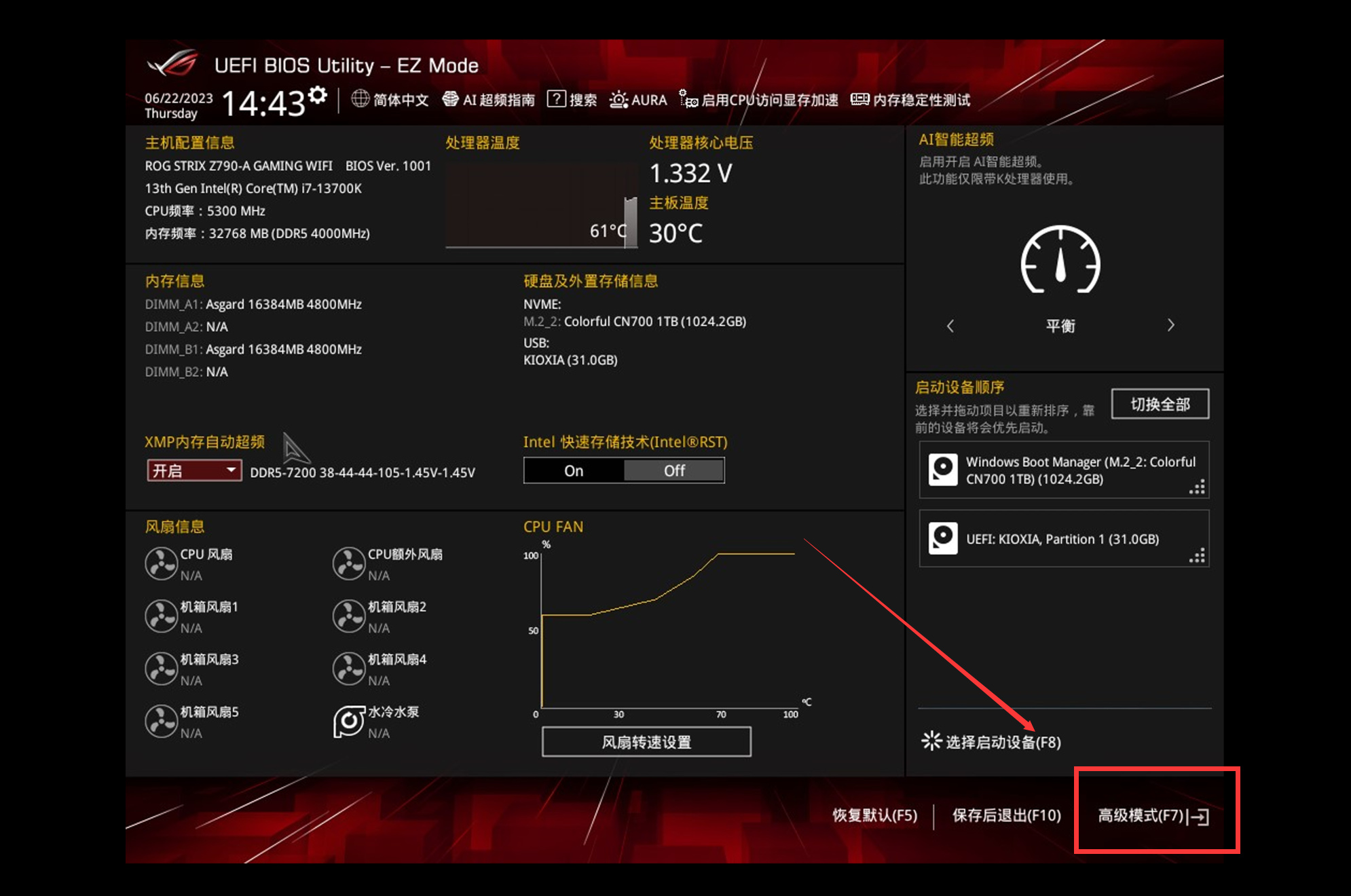御三家的高端主板都有体质评估机制,只不过华硕最出名也具备比较强的参考性,查看方法也比较简单,开机后按键盘上的Del键进入BIOS,点击下图位置或者按F7进入高级模式。