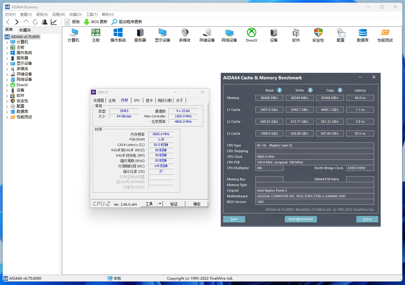 四条内存走手动超频,我这套硬件最高6000MHz+C50,测试结果如下图所示: