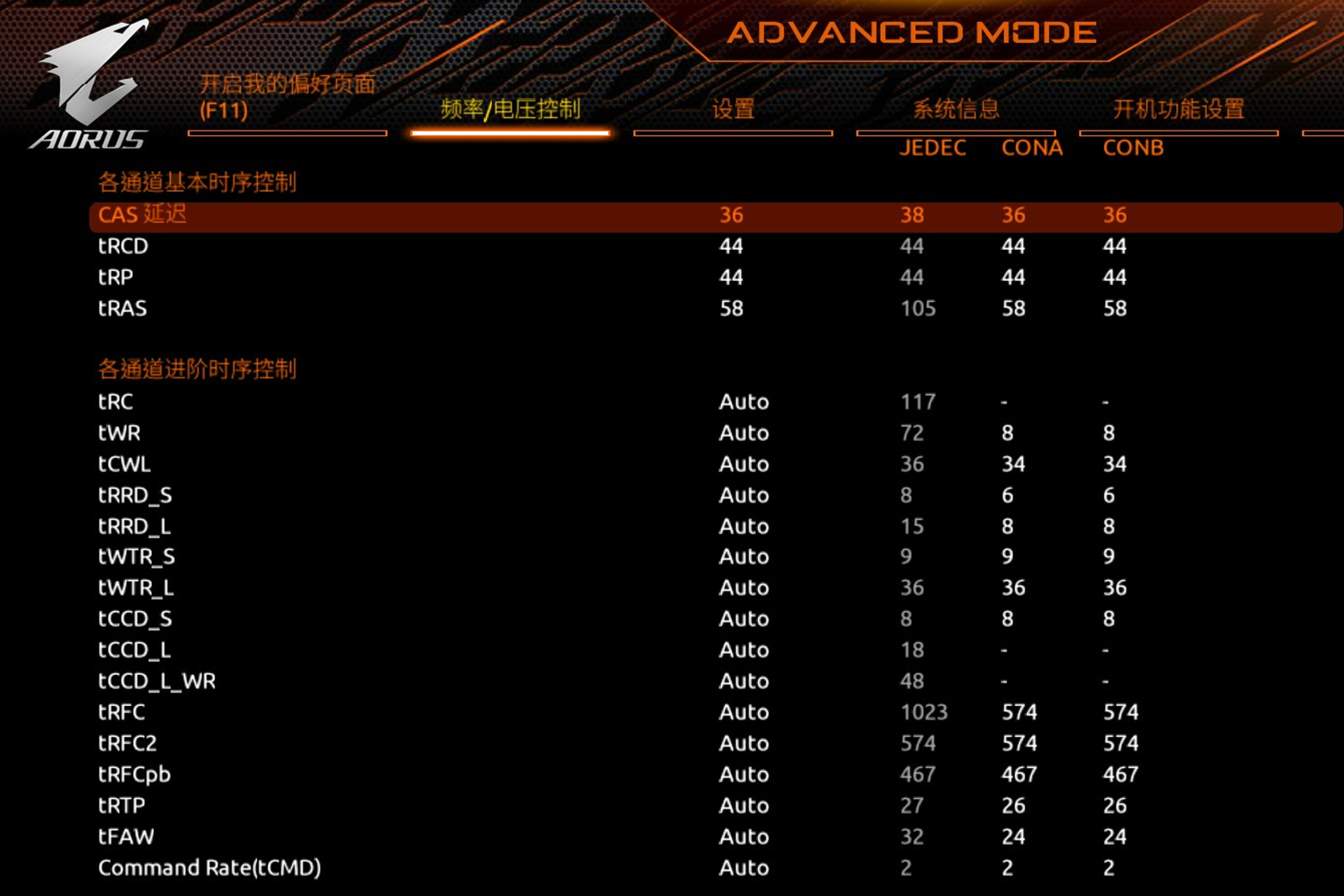 接着同一页面进入内存通道时序的下一级配置页面,直接照抄保底时序: