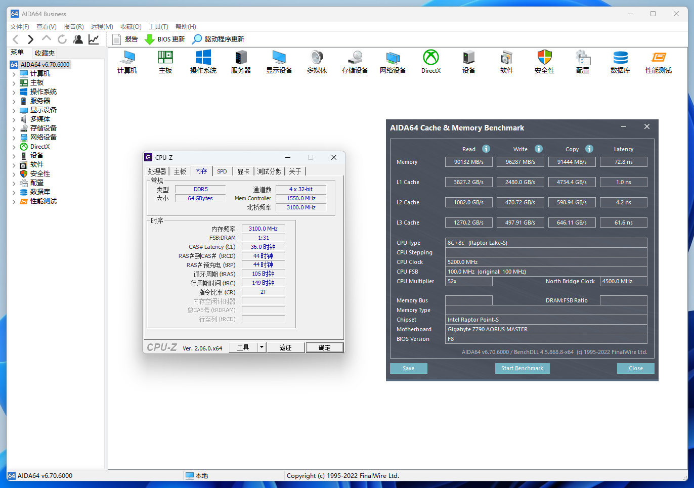 四条内存走手动超频,我这套硬件最高6200MHz+C36,测试结果如下图所示: