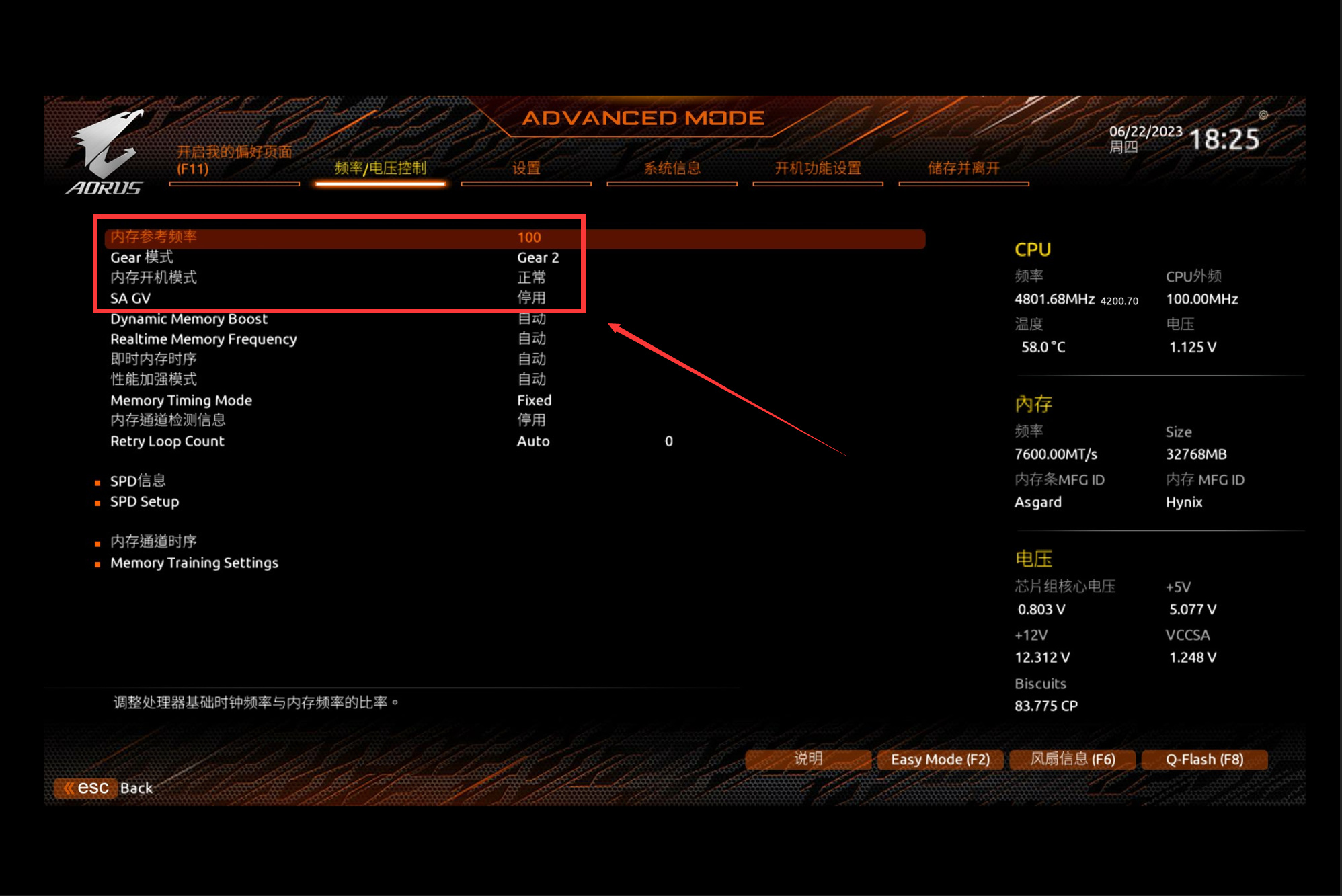 修改内存速度比率模式,配置为100:100。