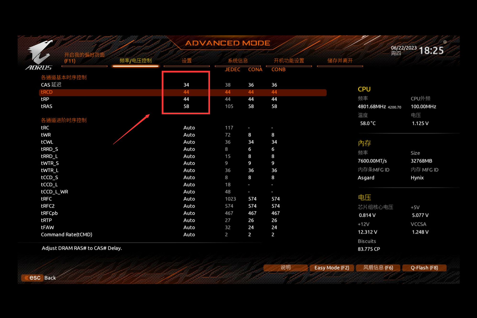 RAS三项均修改为44,冲击7800MHz以上建议修改成46及以上。
