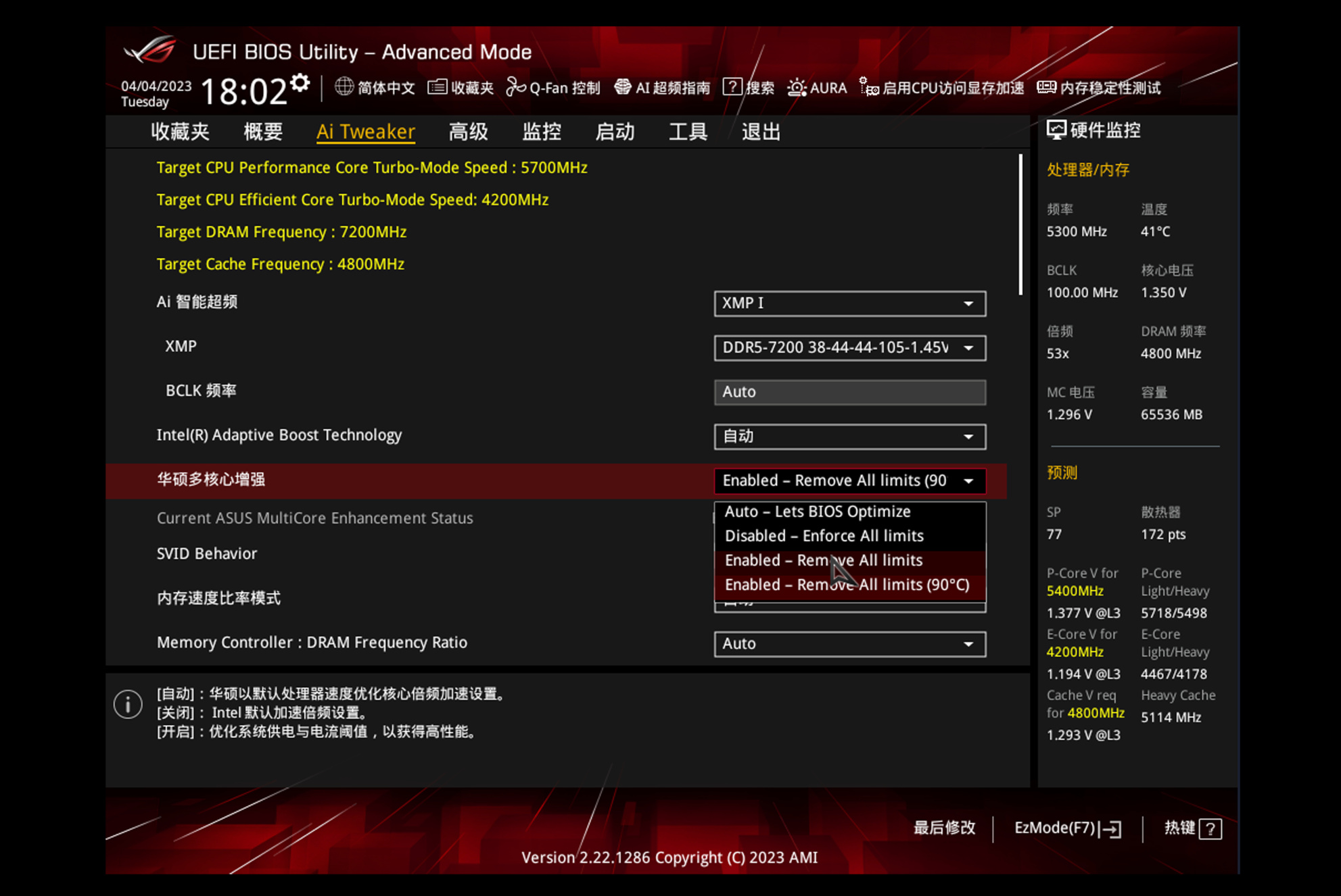 修改华硕多核心增强,配置为Enabled-Remove All Limits(90°)。