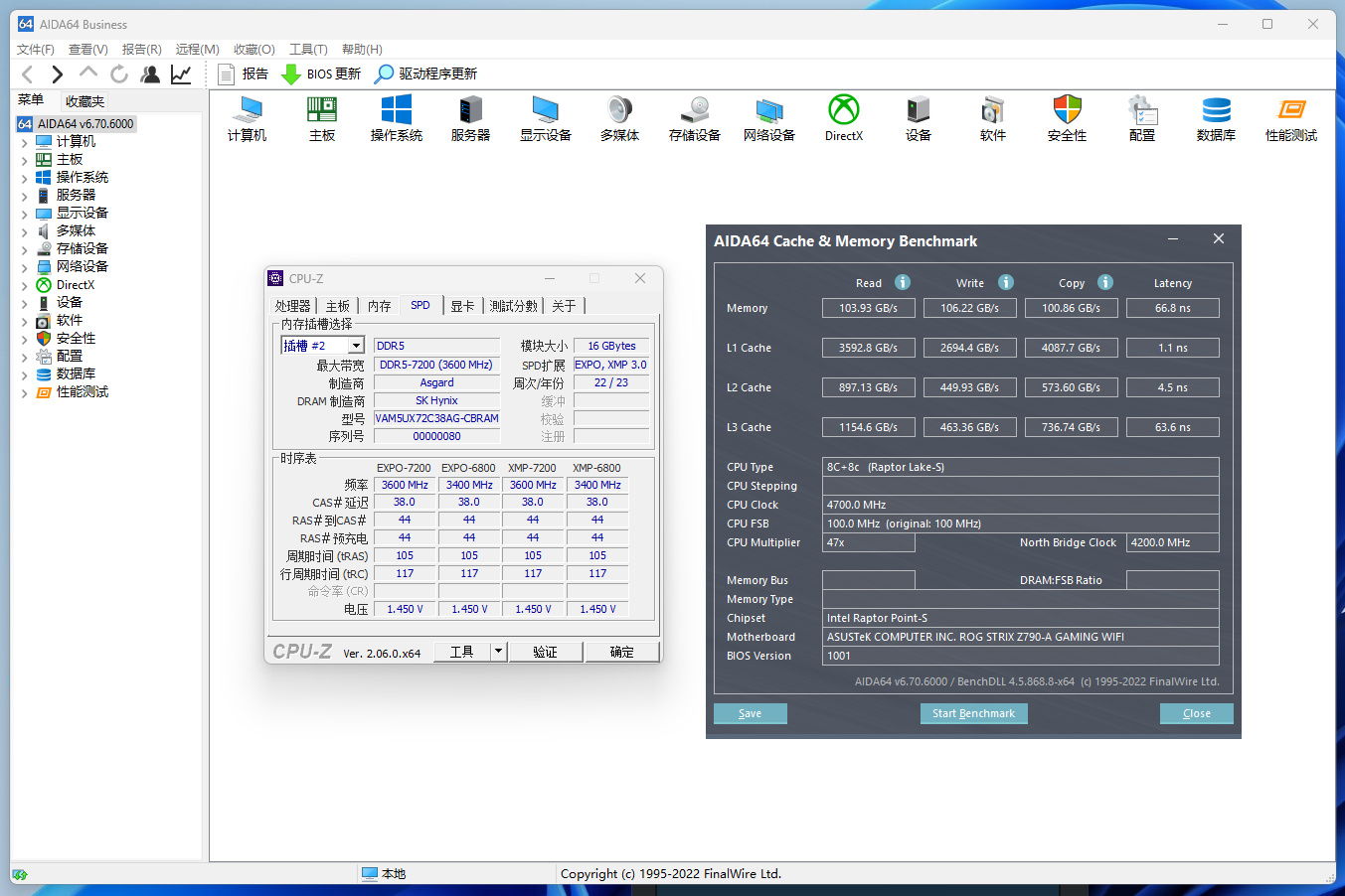 两条内存开启XMP的7200MHz+C38预设,测试结果如下图所示: