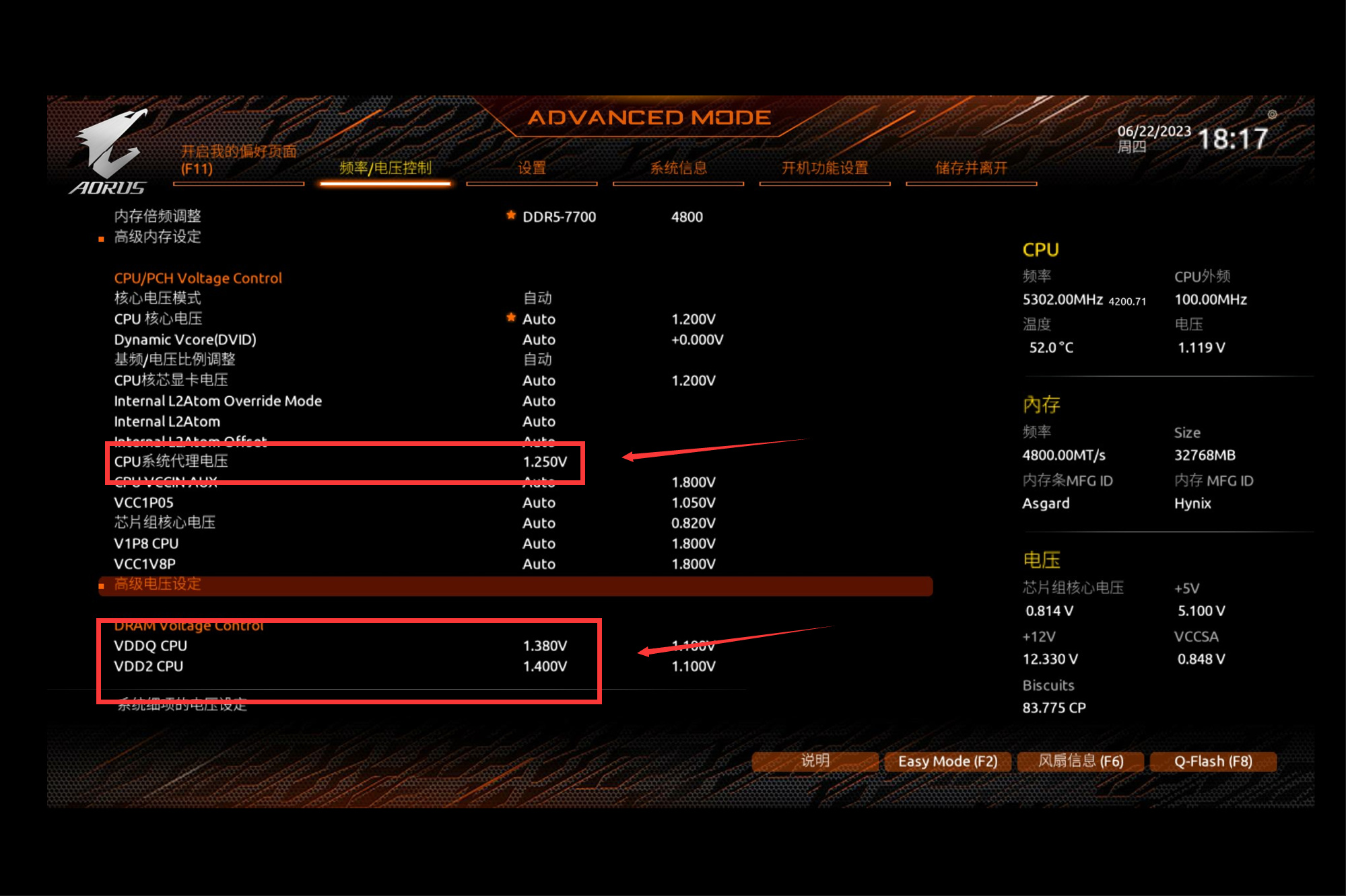 修改VDDQ CPU电压,我这里配置的是1.38V,CPU体质比较好可以1.5V起手。